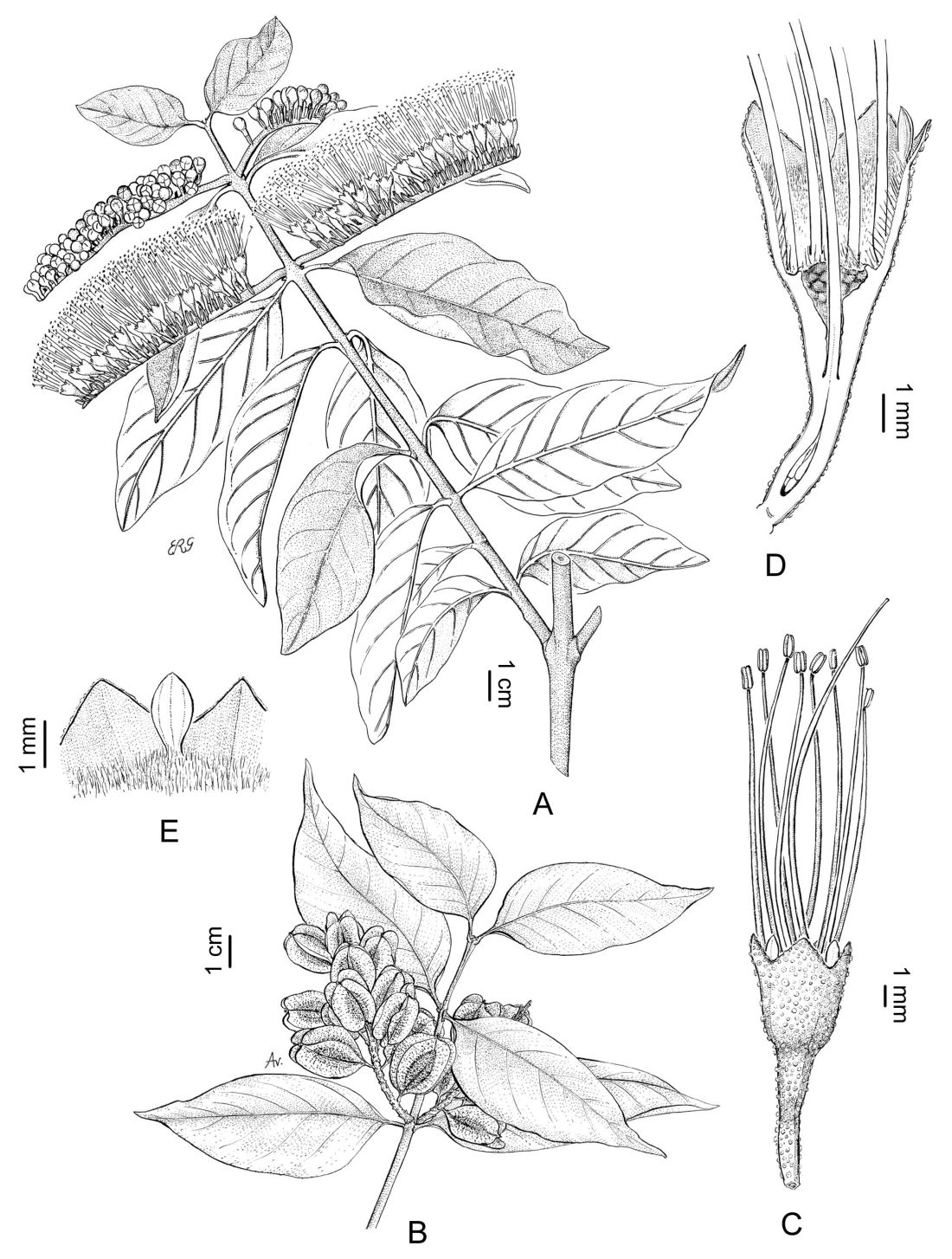 A. Rama florífera. B. Rama fructífera. C. Flor. D. Flor, corte longitudinal. E. Detalle de pétalos y sépalos.