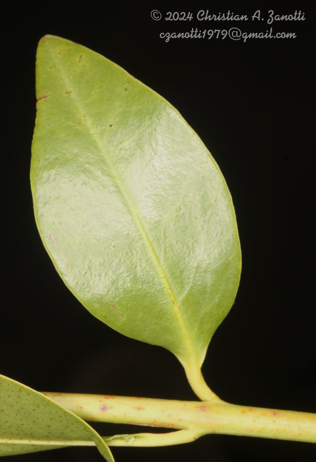 Arbusto trepador, voluble; ramas cilíndricas, glabras; raíces adventicias que salen de los nudos. Hojas alternas, sésiles; láminas lineares, de 20-60 × 1,5-3 mm, coriáceas. Flores blancas o crema, rojizas al secarse, muy perfumadas, de 10-12 mm de largo; pedicelos de 3-4 mm de largo; brácteas y bractéolas inconspicuas; calículo breve, denticulado; pétalos ensanchados hacia la parte superior, de 10-11 × ca. 1 mm, carnosos; estilo filiforme de más o menos igual longitud que los pétalos y estambres. Fruto esférico u obovoide, de 5-7 mm de largo × ca. 4 mm de diámetro, negruzco.