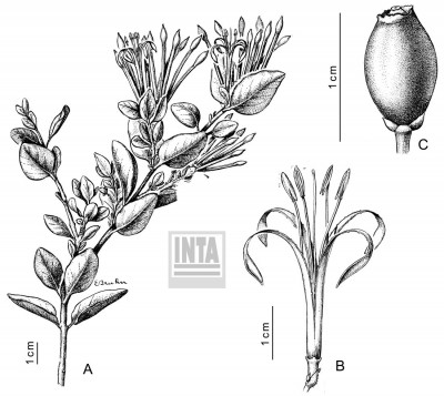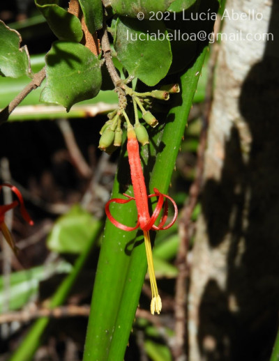 Arbustos con ramas cilíndricas glabras o las jóvenes puberulentas. Hojas opuestas o en verticilos 3-meros; pecíolo de 3-6 mm largo; láminas ovadas, ca. 5 × 4 cm, base cordada, ápice agudo a veces apenas apiculado, verde oscuras, brillantes. Inflorescencia en racimos o corimbos terminales, a veces axilares en ramas laterales, generalmente péndulas, con 20 o más flores. Flores con pedicelos de 4-6 mm de largo,sustentadas por una bráctea y dos bractéolaslibres y persistentes en el fruto; botón floral de 4-4,5 cm de largo, fusiforme, recto; calículo denticulado; pétalos 4, reflexos durante la antesis, rojos; estambres y estilo amarillos al comienzo de la antesis, filamentos y estilos rojizos con el tiempo; estigma capitado, pequeño. Fruto ovoide, ca. 10 × 6 mm, verde.