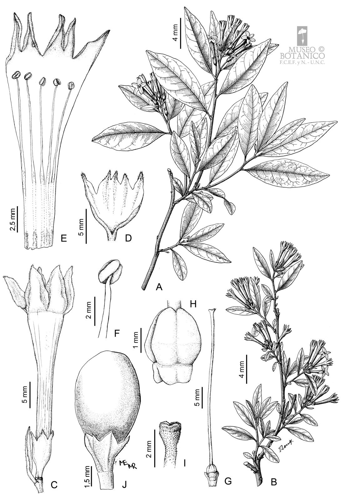 A-B. Ramas floríferas. C. Flor. D. Cáliz desplegado. E. Corola desplegada. F. Estambre, vista dorsal. G. Gineceo. H. Ovario. I. Estigma. J. Fruto.