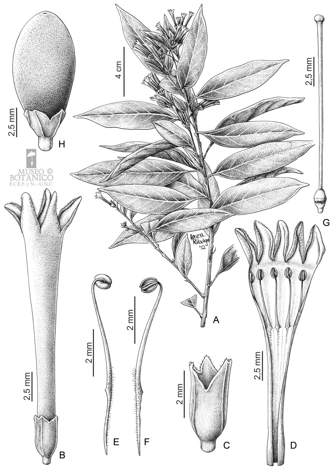 A. Rama florífera. B. Flor. C. Cáliz. D. Corola desplegada. E. Estambre, vista dorsal. F. Estambre, vista ventral. G. Gineceo. H. Fruto.