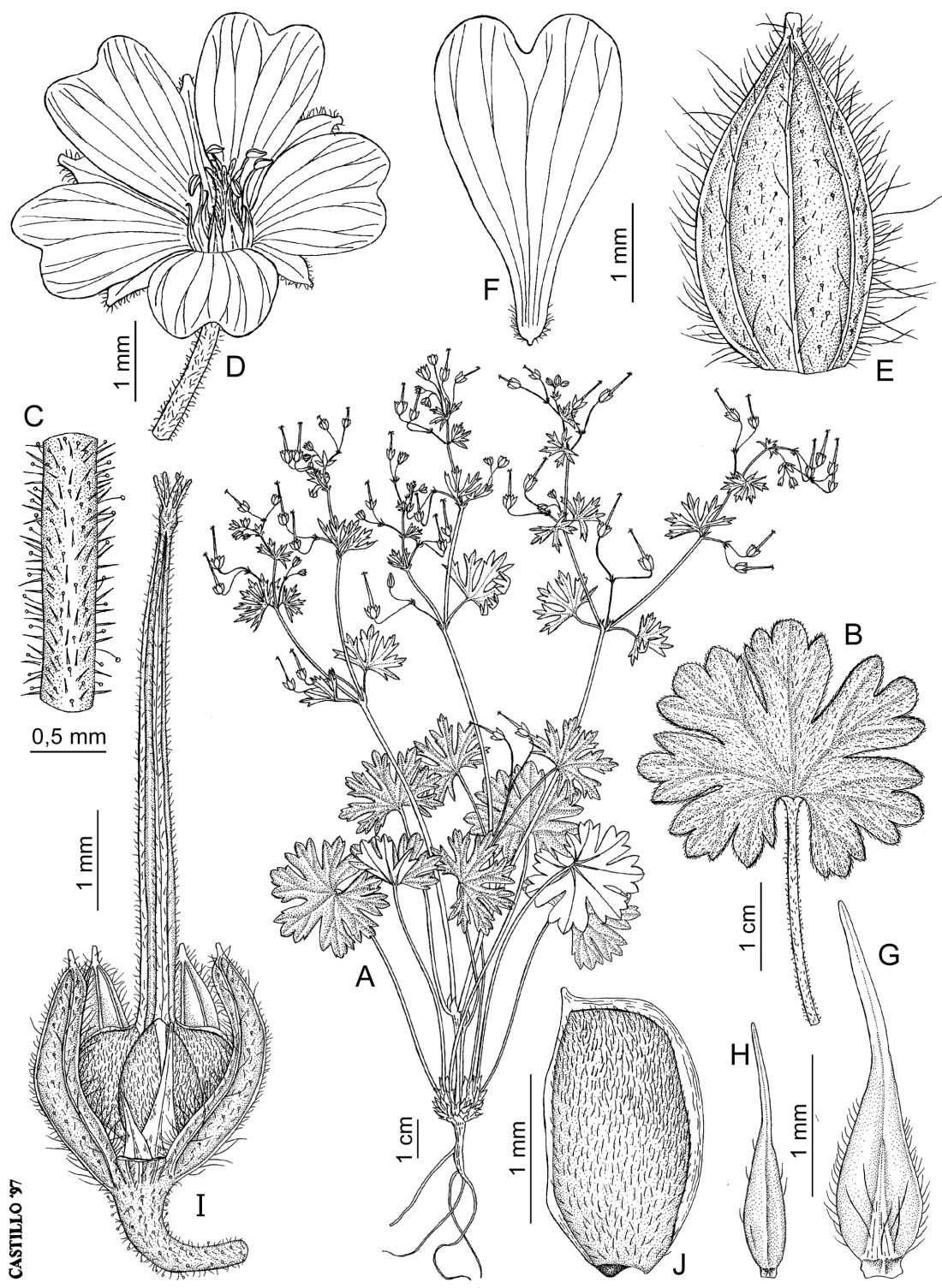 A. Planta. B. Hoja. C. Porción del pedúnculo. D. Flor. E. Sépalo. F. Pétalo. G, H. Filamentos estaminales. I. Fruto, con un sépalo removido. J. Mericarpo.