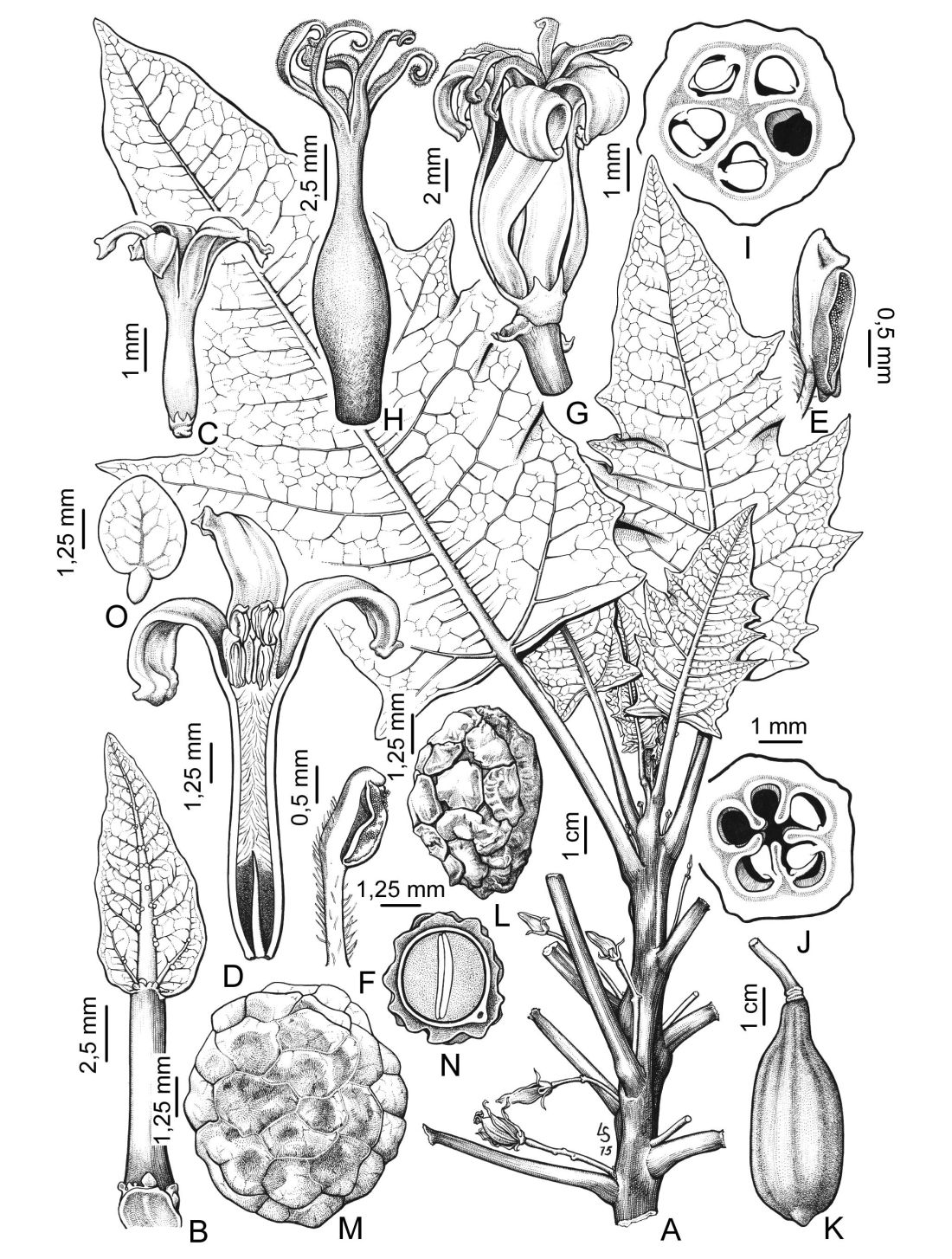 A. Rama florífera pistilada. B. Hoja joven. C. Flor estaminada. D. Flor estaminada, corte longitudinal. E-F. Estambre del ciclo interno y externo del androceo, respectivamente. G. Flor pistilada. H. Pistilo. I.-J. Ovario, transcorte en la mitad y en el ápice, respectivamente. K. Fruto. L-M. Semilla, vista lateral y dorsal respectivamente. N. Semilla, corte transversal. O. Embrión.