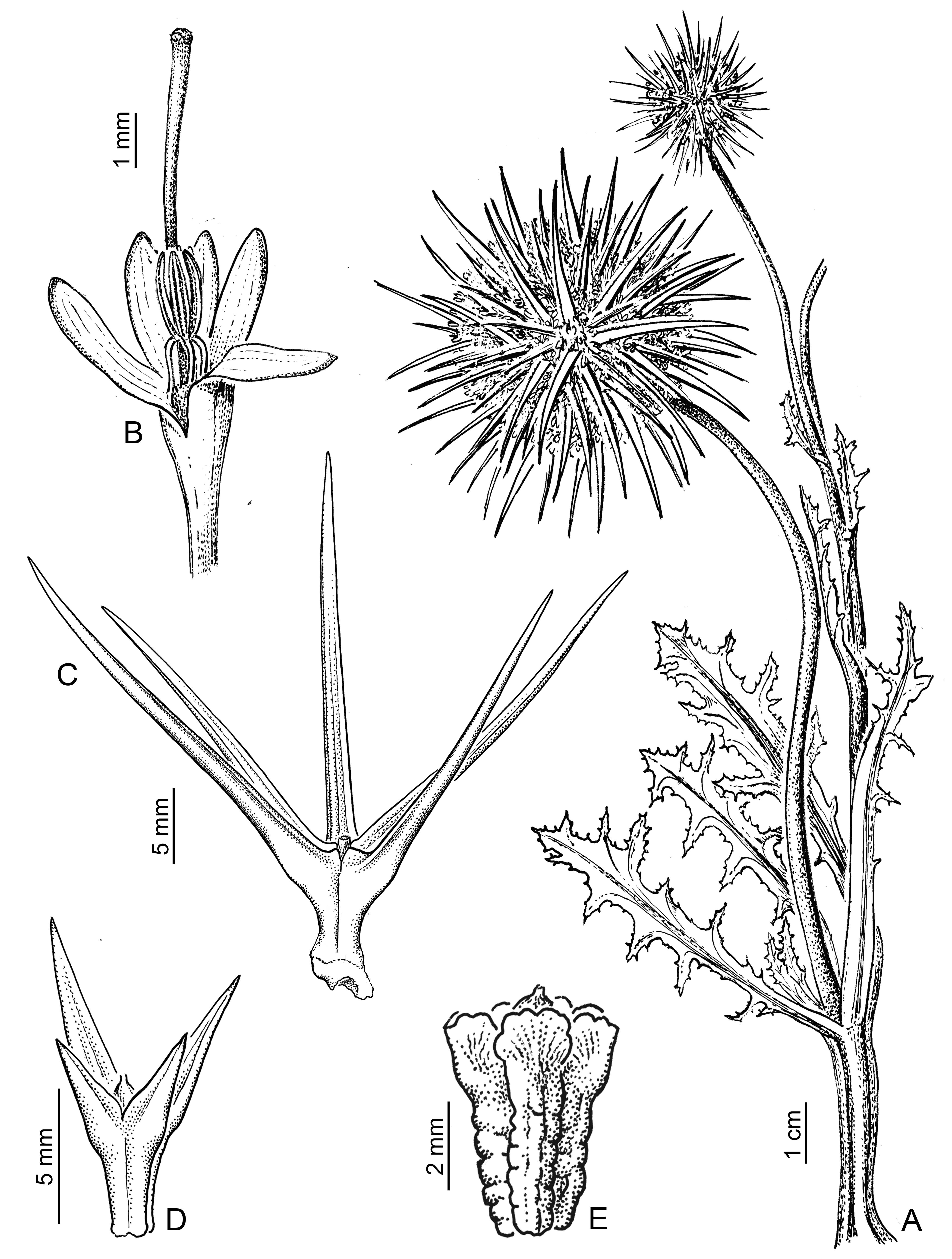 Hierbas hemicriptófitas, con ramas laterales cortas y escapiformes hasta bien desarrolladas y foliosas, postradas o erectas hasta 30 cm de alto. Hojas espatuladas, base atenuada en un pecíolo rectangular; lámina oblonga, entera hasta con divisiones escuarrosas, margen entero o dentado, con un borde diferenciado semitraslúcido y pocos a numerosos tricomas glandulares. Pedúnculos escapiformes, largos. Involucro con o sin base fusionada pateliforme. Brácteas del involucro diferenciadas de las hojas distales, rectangulares o triangulares, con margen entero o dentado-mucronado, ápice obtuso, mucronado. Receptáculo lenticular diminuto, brácteas del receptáculo lineares, espatuladas o rectangulares. Cáliz polimórfico: 2-5 sépalos desiguales, aciculares, hasta de 8 mm de largo, con sección triangular, lignificados en la antesis (flor terminal central y primera flor de cada grupo cimoso); 2-5 sépalos subiguales, largamente triangulares, planos, de 1,5-2 mm de largo, no lignificados en la antesis (segunda y siguientes flores de los grupos cimosos); 5 sépalos iguales, triangulares, cortos, planos, de 0,3-0,5 mm de largo, no lignificados en la antesis (flores solitarias, y segunda y siguientes flores de los grupos cimosos). Tubo estaminalcorolino de 2-4 mm de largo, tubo corolino de 1 mm de largo; lóbulos corolinos oblongos, de 1,1-2 mm de largo. Tubo estaminal de 0,3-0,5 mm de largo, filamentos de 0,3-0,6 mm de largo, anteras oblongas, de 1-1,6 mm de largo; tecas de base obtusa o agudo-sagitada. Cipselas prismáticas, con 3-5 carenas libres (valles visibles) o connadas (valles ocultos); cipselas no espinosas con carenas usualmente arrugadas y sépalos vestigiales o triangulares; cipselas espinosas con carenas lisas y sépalos espinosos arqueados, de acuerdo a la posición y al polimorfismo descrito. Var. herbacea.- Ramas laterales escapiformes; perianto ca. 6 mm de largo, corola verdosa, anteras con base obtusa; brácteas del involucro libres, con margen entero, reflejas y ocultas bajo las flores; cipselas con 4-5 carenas connadas, cipselas armadas con espinas recurvadas.
