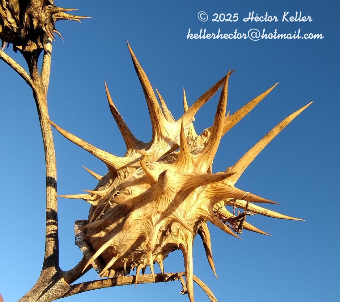 Hierbas anuales, hasta de 0,80(-1) m de alto, glabrescentes a glabras, con tricomas eglandulares, adpresos y antrorsos; tallos jóvenes con algunos tricomas glandulares. Pecíolos de 1,5-6(-8) cm, pubescentes superiormente y con algunos tricomas glandulares cuando jóvenes; láminas ovadas, anchamente ovadas a subdeltoides, de 8-12(-18) × 15-12 cm, base truncada o cuneada desigual, ápice agudo, cuando jóvenes a veces enteras, las adultas sinuadas a irregularmente poco lobadas o dentadas, glabrescentes en ambas caras excepto sobre los nervios principales donde son pubescentes. Flores en las bifurcaciones de los tallos o axilares; pedicelos erectos de 10-15 mm, pubescentes; cáliz tubuloso-anguloso, de 2-4 cm, glabro por dentro y pubescente por fuera con largos tricomas antrorsos y pequeños glandulares, tubo de 2,5-3,5 cm, lóbulos triangular-agudos, de 5 × 1,7-2 mm; corola blanca, de 4-6 cm, con diminutos tricomas glandulares externamente, limbo con 5 lóbulos pequeños y subulados; estambres adheridos a la misma altura en la mitad inferior del tubo corolino, filamentos subiguales, ca. 13,5 mm, anteras de 3- 4,5 mm; ovario ovoide a cónico, pubescente, cubierto de prolonprolongaciones carnosas gruesas, estilo de 20-25 mm, estigma de 2,8 × 2,5 mm. Cápsula ovoide, erecta, íntegramente pubescente, de 3- 5 cm, cubierta con menos de 30 espinas cortas, cónicas, gruesas, estriadas, erectas o recurvadas, hasta de 18(-20) × 2-4(-5) mm de ancho en la base, las inferiores más cortas; semillas reniformes, negras, de 4-4,5(-5) × 3-3,3 mm, episperma reticulado.