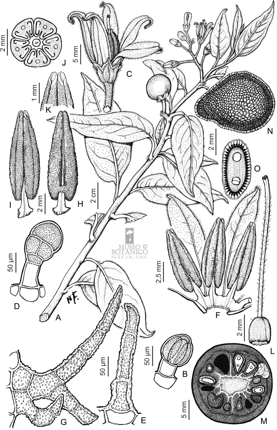 A. Rama con flores y fruto. B. Tricoma glandular de hojas. C. Flor. D. Tricoma glandular del cáliz. E. Tricoma eglandular del cáliz. F. Sector de corola desplegada. G. Tricoma ramificado de la corola. H. Estambre, vista dorsal. I. Estambre, vista ventral. J. Cono estaminal en corte transversal. K. Ápice de antera, cara ventral. L. Gineceo. M. Fruto, corte transversal. N. Semilla. O. Semilla, corte transversal.