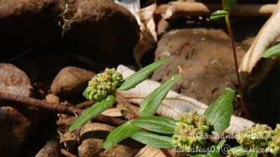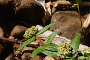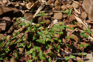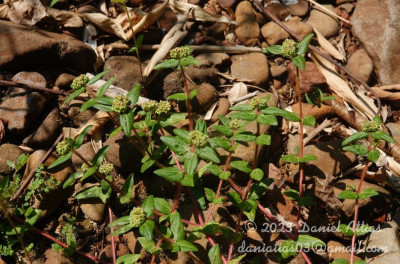 Hierbas anuales, decumbentes o ascendentes, de 20-50 cm de alto, pubescentes, con indumento de tricomas blancos a amarillos. Hojas opuestas; pecíolos de 1-4 mm de largo, pilosos; láminas ovadas a romboidales, de 8-40 × 5-15 mm, ápice agudo, base fuertemente asimétrica, un lado redondeado o levemente cordado o truncado y el otro cuneado a atenuado; margen serrulado a doble serrulado, a menudo con una mancha purpúrea en el centro, el nervio principal y los nervios secundarios hundidos por la cara adaxial, con 3 o 5 nervios desde la base; estípulas triangulares, libres, con tricomas en el margen, a menudo con diminutas glándulas circulares en la base. Inflorescencias en glomérulos capitados de ciatios axilares y terminales (los axilares alternos), con hojas reducidas debajo de los glomérulos; involucro obcónico, de 0,5-1,1 × 0,4-0,9 mm, estriguloso, lóbulos triangulares generalmente enteros con tricomas; nectarios 4, oblongos a reniformes, cóncavos, con apéndices blancos a rosados subcirculares o transversalmente oblongos. Flores estaminadas 2-8; bractéolas 3-dentadas, con tricomas simples. Flores pistiladas aperiantadas, estrigulosas; estilos 2-fidos con tricomas. Fruto una cápsula ovoide a subglobosa, de 1-1,4 × 1,1-1,5 mm. Semillas angostamente ovoides, 4-angulosas en sección transversal, de 0,7-1× 0,5-0,8 mm, rugosas o con 3-6 costillas bajas transversales.