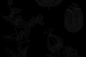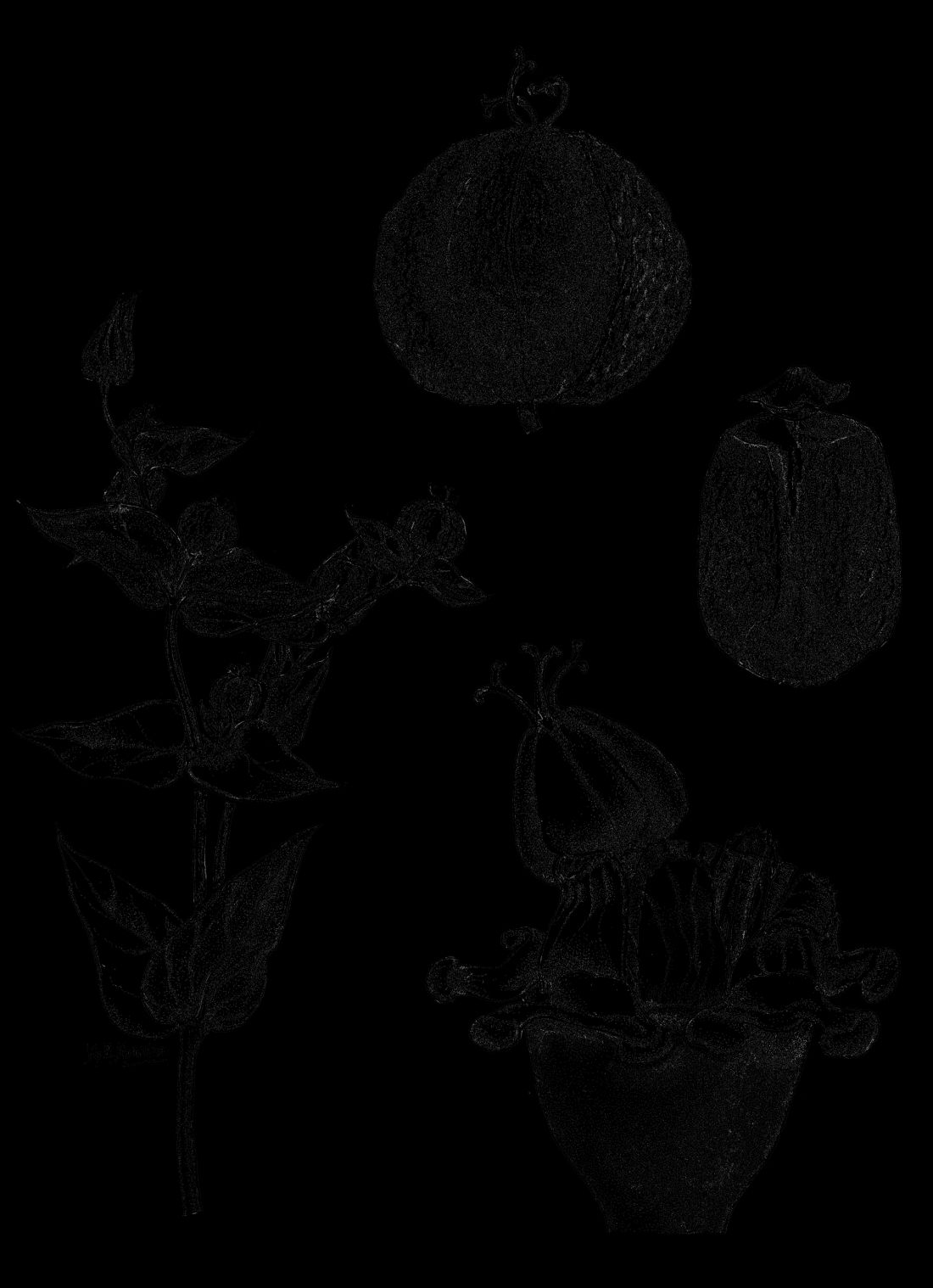 A. Rama fructífera. B. Ciatio. C. Fruto. D. Semilla, vista hilar.