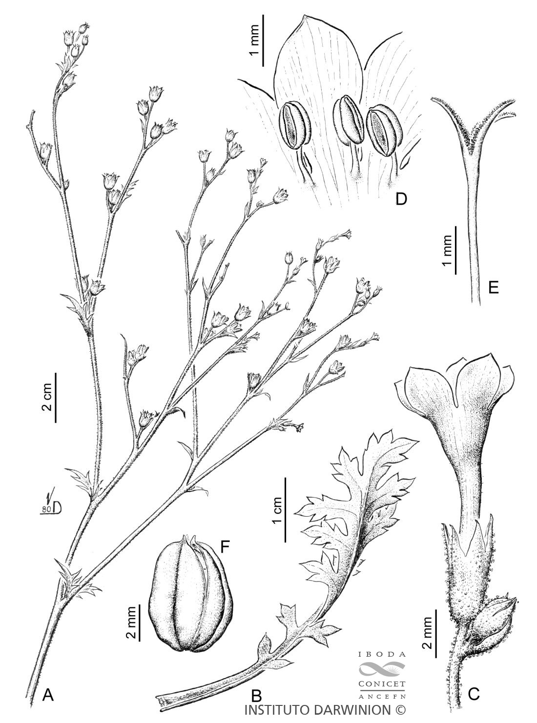 Hierba anual de 15-30 cm de alto, con tallos numerosos, erectos, con pubescencia lanosa o glabra en la porción inferior, glanduloso-pubérula hacia la porción superior. Hojas en roseta basal, pinnatilobadas a pinnatisectas, de 10-40(-50) mm de largo, carnosas, con los segmentos de 0,9-1,5(-2) mm de ancho, el ápice agudo y córneo, hojas caulinares 3-fidas o enteras, de 10-15 mm de largo, con pubescencia lanosa, glandulosas o no, carnosas, sésiles. Inflorescencias cimosas, con 2-3 flores, laxas, pedicelos de 1-8 mm de largo, glanduloso-pubescentes. Flores con cáliz urceolado, de 4-4,5 mm de largo, lacinias linear-lanceoladas, ca. 1,5 mm de largo con dientes agudos y reflexos, con pubescencia glandulosa o glabro; corola infundibuliforme, de 5-9 mm de largo, liliácea y con la garganta más pálida, lóbulos de la corola ovados, subagudos; estambres insertos en la base de los lóbulos corolinos, filamentos subulados, anteras ovoides de color celesteintenso, polen azul; ovario ovoide con ca. 15 óvulos. Fruto una cápsula oblongo-ovoide, de 5-7 mm de largo, mucronada, con el cáliz acrescente de igual o casi igual longitud que el fruto maduro. Semillas 4-11, elipsoideas, de 2-2,5 × 1 mm, amarillentas.