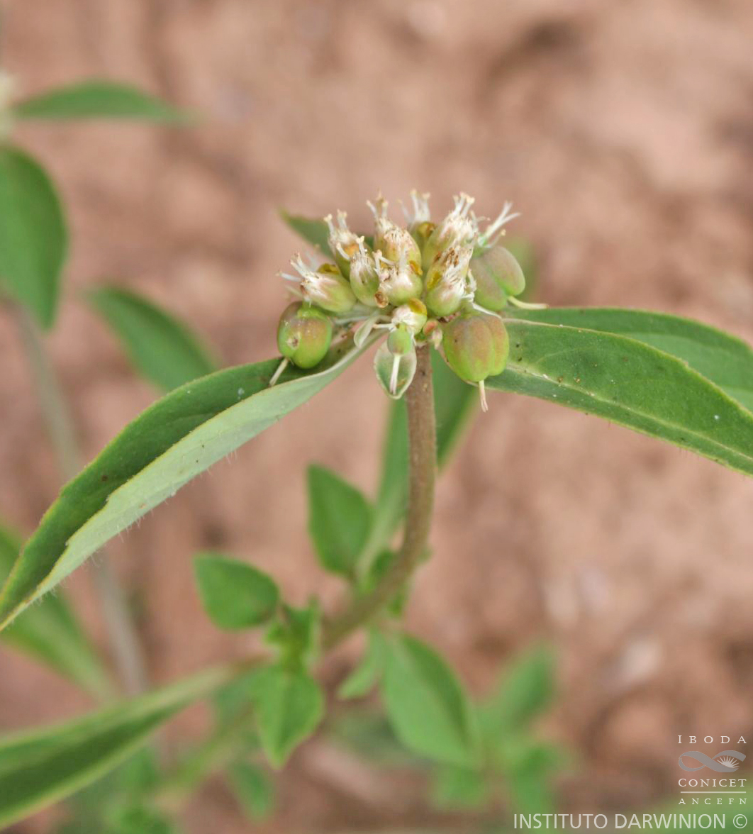 Hierbas anuales, hasta de 50 cm de alto, glabras; tallos erectos, ascendentes, con entrenudos de 2-9 cm de largo, ramas opuestas. Hojas con pecíolos de 3-7 mm de largo; láminas ovadas, de 10-33 × 10-20 mm, el margen dentado, indumento de tricomas verrucosos; láminas foliares por debajo de las inflorescencias blancuzcas, al menos en su porción basal. Ciatios en dicasios simples; involucros cilíndricos, de 2-2,3 × 1-1,2 mm, con indumento escaso; lóbulos rectangulares, levemente más altos que los nectarios, profundamente partidos; segmentos terminados en glándulas; nectarios 2-labiados. Flores estaminadas 15-20; bractéolas 2-partidas, eglandulosas, provistas de tricomas. Flores pistiladas con un breve rodete periántico; estilo 3, indivisos; estigmas 3. Fruto una cápsula globosa, de 3-3,6 × 4-4,5 mm, levemente deprimida. Semillas prismáticas, de 2-2,5 × 2,1-2,4 mm, tuberculadas; carúncula reniforme.