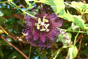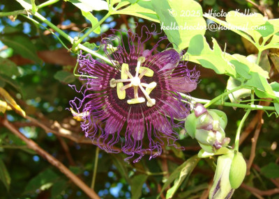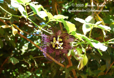 Lianas hasta de 10 m de largo; rizoma horizontal; tallos teretes a subangulosos, apoyantes, ramificados desde la base; zarcillos robustos; estípulas subuladas, de 6-15 × 0,3-1 mm, rara vez con glándulas esféricas en los bordes. Pecíolos de 25-70 mm de largo, con 2 glándulas sésiles, discoides cerca de la base, de 1,2-2,2 mm de diámetro, negras. Láminas de contorno semicircular, palmatisectas, 5-segmentadas, de 40-105 × 60-115 mm, coriáceas, borde crenado y generalmente con pequeñas glándulas sésiles; segmentos elípticos a lanceolados, de 30-105 × 15-45 mm; nerviación reticulada, con 5 nervios principales notorios, 1 en cada segmento; cara abaxial verde-oscura, brillante, la adaxial más clara. Pedúnculos de 15-75 mm de largo, pilosiúsculos, con brácteas en el ápice; brácteas sésiles, oblongas, de 25-40 × 13-30 mm, cuculadas, verde-claras, con varios nervios paralelos, margen con 0-10 glándulas sésiles, discoides, de 0,5-3 mm de diámetro, negras; pedicelo floral de 4-10 mm de largo, piloso, verde. Flores de 70-90 mm de diámetro, de aroma suave; hipanto de 7-15 mm de largo, copa floral de 4-10 mm de largo, introrsa en la base, con tubo floral levemente campanulado, de 3-5 mm de largo; sépalos oblongos, de 30-45 × 10-18 mm, cuculados, de bordes delgados, levemente carnosos, rosados a lilacinos en la cara adaxial, con bordes más oscuros, verdosos, en la cara abaxial, eglandulosos, apéndice dorsal subapical, de 3,5-10 × 1-2 mm en su parte media, foliáceo, piloso; pétalos lanceolados, de 25-40 × 6-10 mm, hialinos, de bordes enteros, rosados a violáceos; corona con los radii en 2 series radiadas y alternas, filiformes, de 16-30 × 0,3-0,9 mm, flexuosos hacia la porción apical, la mitad basal rojizo-oscura con bandas transversales liláceo-rosadas, la mitad apical azul a violáceo oscuro; pali en 8-9 series, desde blancos en la mitad inferior y azulados en la superior a totalmente violáceos; primera serie con apéndices filamentosos, de 3,5-13 × 0,2-0,5 mm; los de la 2da. a 4ta. series capilares, de 2-2,5 mm de largo; los de la 5ta. a 7ma. series capilares, de 5-7 mm de largo, con ápice ensanchado; los de la 8va. a 9na. series capilares, de 7-15 mm de largo, con ápice ensanchado y una zona basal entera de 2 mm de largo; operculum erecto, no plicativo, con base membranácea de 1,5-5 mm de largo y filamentos en doble hilera hacia la parte superior de la cara abaxial, de 6-8 × 0,2-0,7 mm, capitados; anillo nectarífero ca. 0,5 mm de largo, membranáceo; limen de 4,5-7 mm de largo, membranáceo, cupuliforme, con los 3-5 mm basales adnatos al androginóforo; androginóforo de 14-18 × 2-3,5 mm, blancuzco y con manchas violáceo-oscuras; trochlea de 1,5 mm de largo, engrosada, blanca, hallándose a 1,5 mm de la base del androginóforo; porción superior del filamento estaminal libre de 10-15 × 1,5-4 mm, verdosa, con pequeñas máculas rojizas; anteras de 11-12 × 2-5 mm, verdosas y con máculas rojizas; polen amarillooro; ovario de con