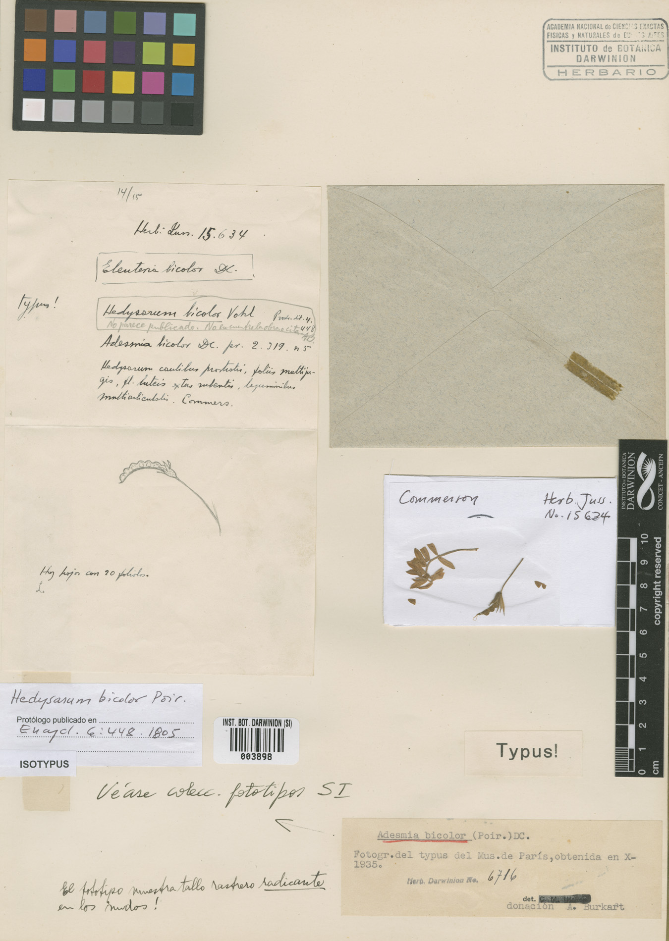 Hierba de 15-30 cm alt., perenne, viajera. Raíz principal axonomorfa, profunda, las adventicias en general menores. Tallos largos, rastreros, radicantes en los nudos, ramosos, ascendentes en el ápice, indumento tenue y breve. Hojas desde 2,5 cm (en formas bajas) hasta 22 cm, alternas, paripinnadas, 6-13-yugadas, distanciadas en los tallos largos, o po¬cas, fasciculadas, en ramillas laterales; estípulas herbáceas, persistentes, ovadas; pecíolo tenue, breve o, en hojas básales, muy alargado y superando a veces la mitad del largo to¬tal de la hoja; folíolos de 2-17 x 0,8-6 mm, opuestos, herbáceos, peciolulados, elípticos, 1-nervios, emarginados o mucronulados, plegados a planos. Racimos de 2-45 cm, laxiflo-ros, tenues, brácteas de 2-5 mm, herbáceas, persistentes, pubérulas; pedicelos de 0,4-4 cm, gráciles. Flores de 1-1,4 cm; cáliz de 8-11 mm con tubo alargado, pubescente, dien¬tes algo menores que el tubo; corola casi dos veces mayor que el cáliz, amarilla con líne¬as rojas; vexilo amplio, pubescente; uña de los pétalos larga; quilla glabra, aguda. Estam¬bres, los dos superiores adheridos a la base de la uña del vexilo. Ovario pubescente. Lo¬mento de 1,2-3 cm, 4-9-articulado, recto o levemente incurvo, rara vez erguido, linear, comprimido, marginado, subtoruloso, pubescente y con pelos glandulosos amarillentos tenues, rara vez glabro; artejos lenticulares, dehiscentes, con borde placentar persistente, pero a veces artejos indehiscentes, o dehiscentes, quebrándose sin dejar semirreplo; semi¬llas de 2-2,2 x 1,8-2,4 mm, mitriformes, oscuras, maculadas de pardo y negro, sin endos-perma.