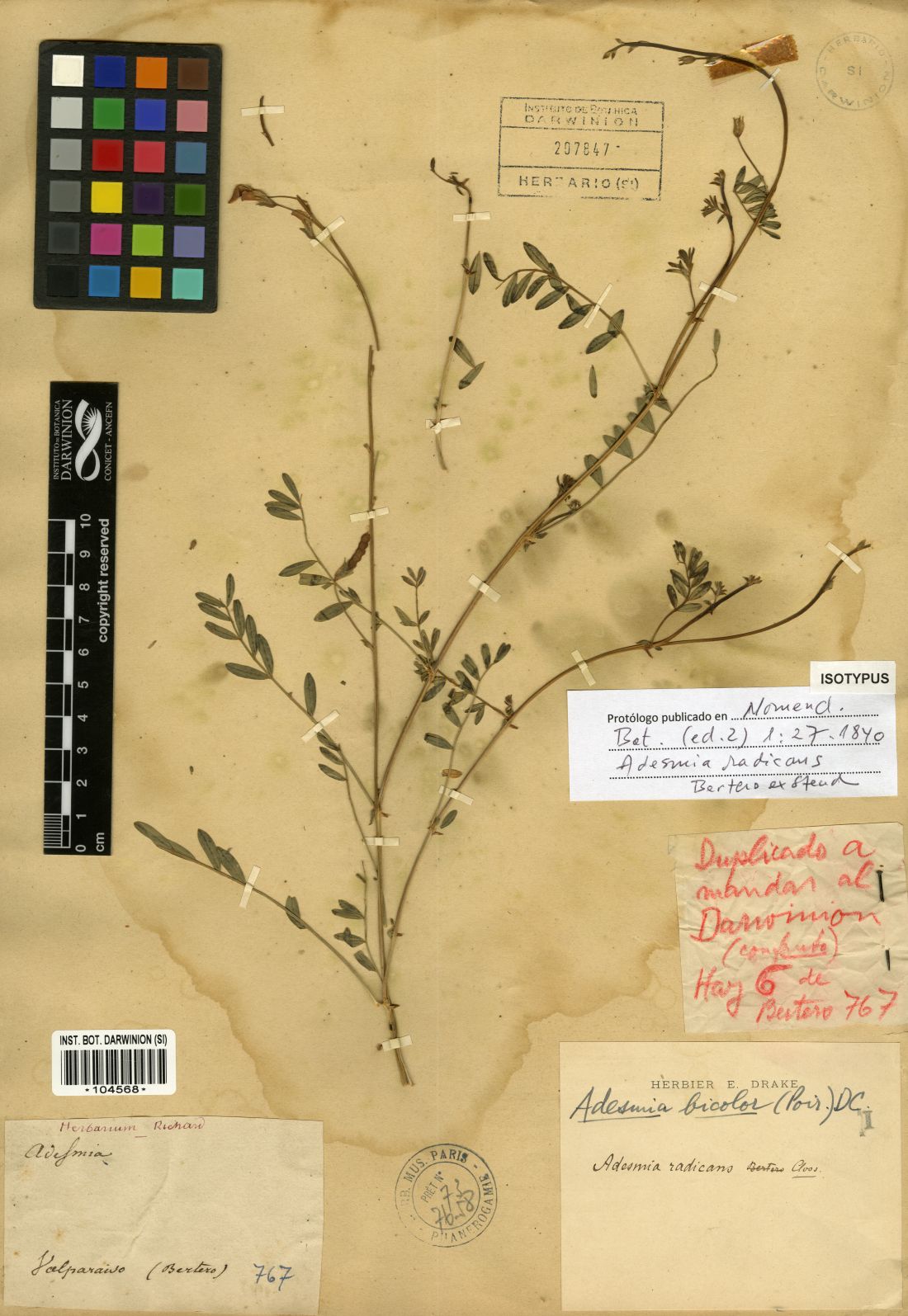 Hierba de 15-30 cm alt., perenne, viajera. Raíz principal axonomorfa, profunda, las adventicias en general menores. Tallos largos, rastreros, radicantes en los nudos, ramosos, ascendentes en el ápice, indumento tenue y breve. Hojas desde 2,5 cm (en formas bajas) hasta 22 cm, alternas, paripinnadas, 6-13-yugadas, distanciadas en los tallos largos, o po¬cas, fasciculadas, en ramillas laterales; estípulas herbáceas, persistentes, ovadas; pecíolo tenue, breve o, en hojas básales, muy alargado y superando a veces la mitad del largo to¬tal de la hoja; folíolos de 2-17 x 0,8-6 mm, opuestos, herbáceos, peciolulados, elípticos, 1-nervios, emarginados o mucronulados, plegados a planos. Racimos de 2-45 cm, laxiflo-ros, tenues, brácteas de 2-5 mm, herbáceas, persistentes, pubérulas; pedicelos de 0,4-4 cm, gráciles. Flores de 1-1,4 cm; cáliz de 8-11 mm con tubo alargado, pubescente, dien¬tes algo menores que el tubo; corola casi dos veces mayor que el cáliz, amarilla con líne¬as rojas; vexilo amplio, pubescente; uña de los pétalos larga; quilla glabra, aguda. Estam¬bres, los dos superiores adheridos a la base de la uña del vexilo. Ovario pubescente. Lo¬mento de 1,2-3 cm, 4-9-articulado, recto o levemente incurvo, rara vez erguido, linear, comprimido, marginado, subtoruloso, pubescente y con pelos glandulosos amarillentos tenues, rara vez glabro; artejos lenticulares, dehiscentes, con borde placentar persistente, pero a veces artejos indehiscentes, o dehiscentes, quebrándose sin dejar semirreplo; semi¬llas de 2-2,2 x 1,8-2,4 mm, mitriformes, oscuras, maculadas de pardo y negro, sin endos-perma.