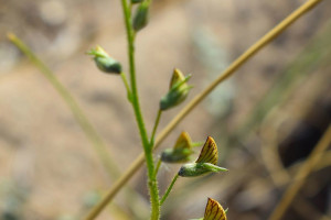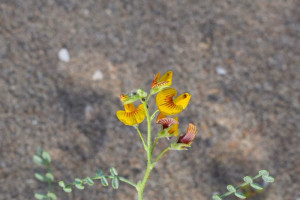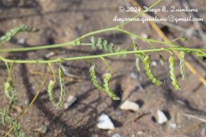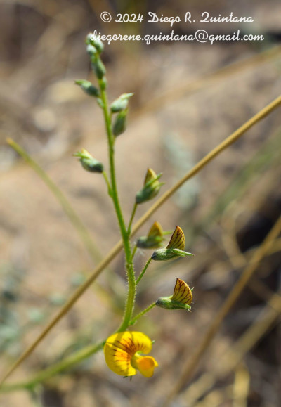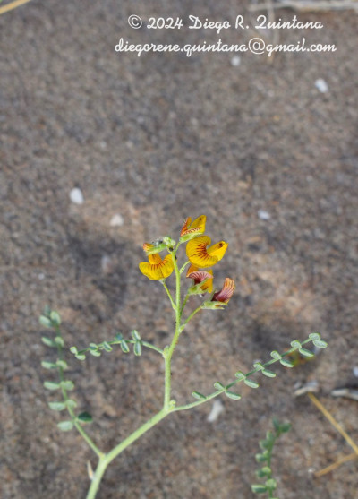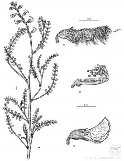 Herbácea de 10-50 cm alt. Raíz única, delgada, vertical, amarillenta. Tallos varios, ascendentes a erectos, glabrescentes a pubescentes, amarillentos. Hojas de 30-50 mm, pe¬cioladas, 5-8-yugadas; folíolos de ± 4-6 x 2-3 mm, elípticos a orbiculares, dispuestos la¬xamente sobre el raquis; pubescencia corta, suave en ambas caras, de pelitos blancos que dan una coloración grisácea y algunos glandulosos. Racimos simples, alargados, laxos, so¬brepasando las hojas. Flores pediceladas; pedicelos de 3-5 mm, hispídulos, glandulosos; cáliz pubescente, glanduloso, dientes desiguales más largos o iguales al tubo; vexilo ge¬neralmente glabro exteriormente, amarillo, rubrolineado, obtuso, amplio, uña corta, cóncava, barbelada interiormente; alas y quilla ± del mismo largo que el vexilo, quilla an¬cha, aguda, ciliada en el borde inferior. Ovario recto, pubescente, pluriovulado. Lomen¬to con pubescencia rala y cerdas plumosas, blanquecinas, largas, con 6-9 artejos indehis¬centes que se desarticula sin dejar semirreplo.