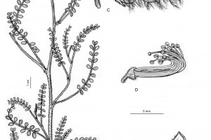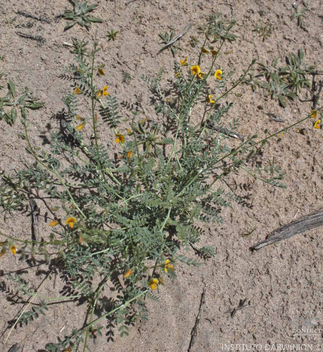 Herbácea de 10-50 cm alt. Raíz única, delgada, vertical, amarillenta. Tallos varios, ascendentes a erectos, glabrescentes a pubescentes, amarillentos. Hojas de 30-50 mm, pe¬cioladas, 5-8-yugadas; folíolos de ± 4-6 x 2-3 mm, elípticos a orbiculares, dispuestos la¬xamente sobre el raquis; pubescencia corta, suave en ambas caras, de pelitos blancos que dan una coloración grisácea y algunos glandulosos. Racimos simples, alargados, laxos, so¬brepasando las hojas. Flores pediceladas; pedicelos de 3-5 mm, hispídulos, glandulosos; cáliz pubescente, glanduloso, dientes desiguales más largos o iguales al tubo; vexilo ge¬neralmente glabro exteriormente, amarillo, rubrolineado, obtuso, amplio, uña corta, cóncava, barbelada interiormente; alas y quilla ± del mismo largo que el vexilo, quilla an¬cha, aguda, ciliada en el borde inferior. Ovario recto, pubescente, pluriovulado. Lomen¬to con pubescencia rala y cerdas plumosas, blanquecinas, largas, con 6-9 artejos indehis¬centes que se desarticula sin dejar semirreplo.