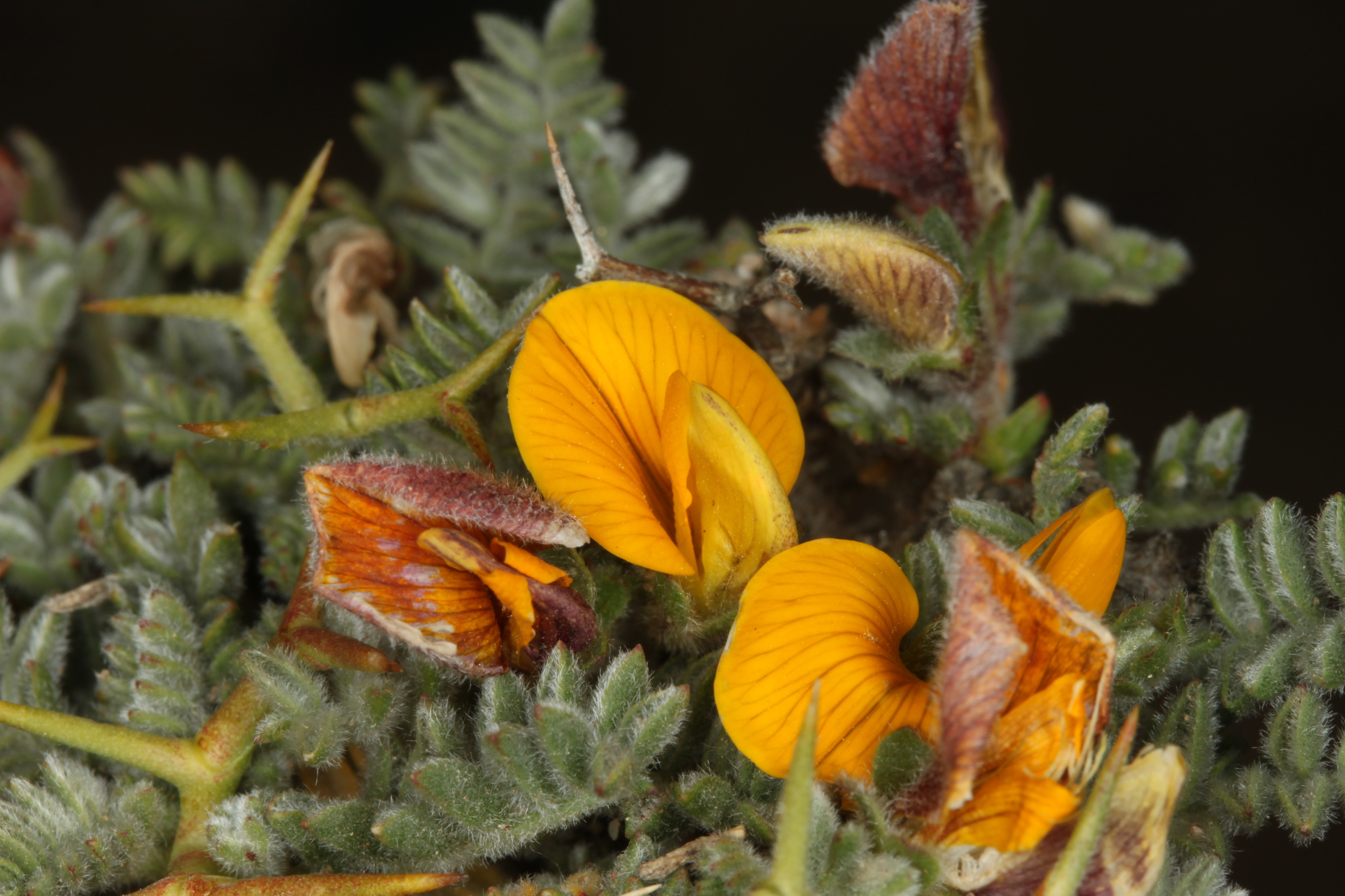 Arbustos bajos, generalmente al ras del suelo, 4-10(-30) cm alt., a menudo formando cojines compactos, hasta 50 cm diám., ramas subterráneas alargadas, rara vez radicantes, comúnmente pubescentes hasta seríceas, eglandulosas; raíz axonomorfa. Espinas estériles 2-4 divididas que superan al follaje. Hojas, 0,8-1,5 cm long., seríceo-pubescentes, fasciculadas sobre braquiblastos en ramas adultas; folíolos 3-7 pares, elíptico-obovados, generalmente conduplicados, 3-7 mm long. x 1-2,5 mm lat., subagudos a obtusos, generalmente pubescentes. Flores, 1-1,2 cm long. en infloresencias umbeliformes paucifloras entre las hojas; brácteas ovadas, pequeñas, persistentes, pedicelos pubescentes, 2-7,5 mm long.; cáliz comúnmente pubescente, 5-7 mm long., lóbulos subiguales, 3-5 mm long., superando algo al tubo, subfoliáceos, ensanchados hasta 1, 9 mm lat., obtusos o mucronados; corola con el estandarte pubescente en el dorso; ovario densamente pubescente, 4-ovulado. Lomento breve, a menudo incluso en el cáliz, 1-3 articulado; artejos semicirculares, 2,5-3 mm diám, pubérulos, reticulados, generalmente con cerdas pilosas de 1-2 mm long.