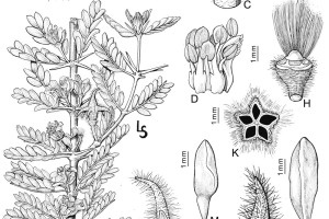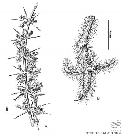 Arbusto; entrenudos de 1-3 cm de largo, con (3-)4 espinas en cada nudo de 1-2 cm de largo; estípulas lineares, de 3-4 mm de largo. Hojas 5-7-yugas, ca. 20 × 10 mm; folíolos lineares, falcados, de 1-1,5 × 4-5 mm, mucronados, densamente pubescentes; sépalos ovados, de 4-5 × 2 mm, agudos, pubescentes; pétalos obovados, de 6-7 × 1,5-2 mm, amarillentos; estambres de 5-6 mm de largo, filamentos subulados, provistos de escamas, una de ellas muy gruesa, carnosa y connada en casi toda su longitud al filamento; pistilo ca. 4 mm de largo, hirsuto-viloso, con los tricomas ocultando la espina dorsal que lleva cada carpelo. Fruto carcérulo fusiforme, ca. 12 × 10 mm, tomentoso, 5-surcado, con 5 espinas ca. 4 mm de largo, encorvadas hacia abajo.