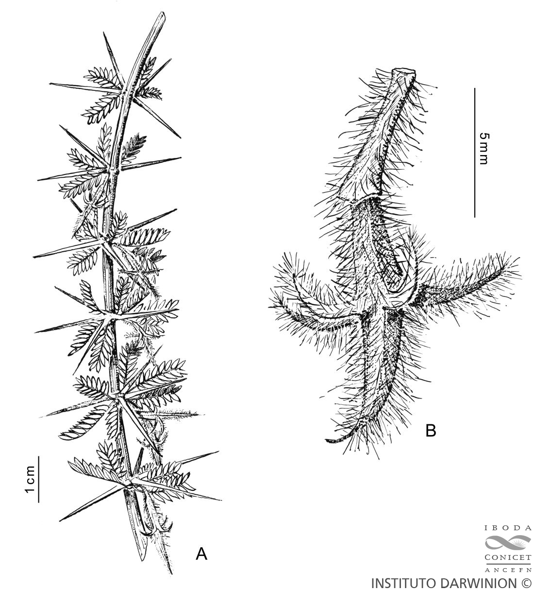Arbusto; entrenudos de 1-3 cm de largo, con (3-)4 espinas en cada nudo de 1-2 cm de largo; estípulas lineares, de 3-4 mm de largo. Hojas 5-7-yugas, ca. 20 × 10 mm; folíolos lineares, falcados, de 1-1,5 × 4-5 mm, mucronados, densamente pubescentes; sépalos ovados, de 4-5 × 2 mm, agudos, pubescentes; pétalos obovados, de 6-7 × 1,5-2 mm, amarillentos; estambres de 5-6 mm de largo, filamentos subulados, provistos de escamas, una de ellas muy gruesa, carnosa y connada en casi toda su longitud al filamento; pistilo ca. 4 mm de largo, hirsuto-viloso, con los tricomas ocultando la espina dorsal que lleva cada carpelo. Fruto carcérulo fusiforme, ca. 12 × 10 mm, tomentoso, 5-surcado, con 5 espinas ca. 4 mm de largo, encorvadas hacia abajo.