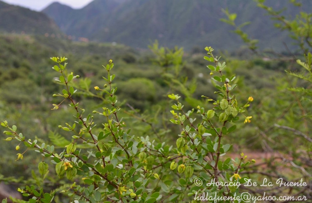 Arbusto de 1-4 m de alto; ramas sinuosas; entrenudos de 1-3 cm de largo. Hojas de 1,8-6 × 1,5-4,5 cm, con (2-)4-6 folíolos; pecíolo de 0,3-1 cm de largo con tricomas amarillo-rojizos; raquis canaliculado; folíolos oblongos, de 0,8-3,3 × 0,5-3 cm, subopuestos, a casi opuestos, con los pseudopares bastante distanciados en el raquis, los apicales mayores que los basales, mucronulados, glabrescentes, en su base con tricomas cortos, adpresos, 1-celulares, 2-5 nervados; estípulas ovales, de 2-3 mm de largo, acuminadas, caducas, rojizas. Flores 1-2, axilares; pedúnculo de 0,5-2 cm de largo; sépalos desiguales, de 4-8 × 3-6 mm, pubescentes; pétalos de 6-12 × 2-4 mm, amarillos; estambres de 5-9,5 mm de largo, filamentos de 3,6-7,4 mm de largo; escama de 2,6-4,7 mm de largo, connada hasta ± 1/3 de su longitud, con borde irregular apenas 6-laciniado; anteras obovoides, sagitadas, de 1,2-1,9 mm de largo, agudas; ovario 5-carpelar, 5-locular, con 2-7 óvulos por lóculo, de 4 mm de largo, cubierto de tricomas amarillento-rojizos; estilo 3,5-4 mm de largo. Fruto elipsoide, de 13-20 × 10-18 mm, 5-alado, pubérulo; carpóforo de 0,1-10 mm de largo. Semilla subreniforme, de 4,5-7 × 1,0-2,0 mm, con endosperma.