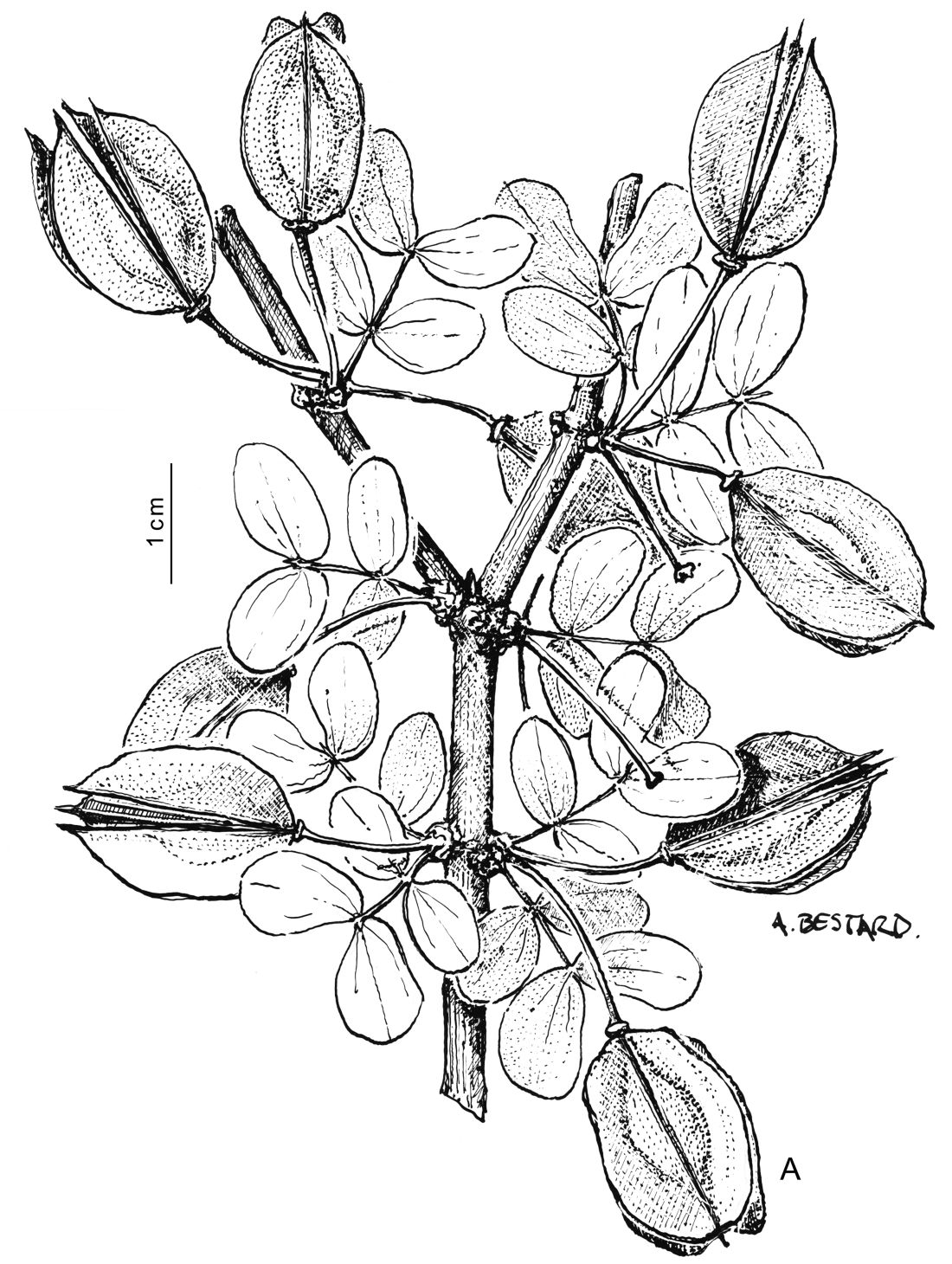Arbusto de 1-4 m de alto; ramas sinuosas; entrenudos de 1-3 cm de largo. Hojas de 1,8-6 × 1,5-4,5 cm, con (2-)4-6 folíolos; pecíolo de 0,3-1 cm de largo con tricomas amarillo-rojizos; raquis canaliculado; folíolos oblongos, de 0,8-3,3 × 0,5-3 cm, subopuestos, a casi opuestos, con los pseudopares bastante distanciados en el raquis, los apicales mayores que los basales, mucronulados, glabrescentes, en su base con tricomas cortos, adpresos, 1-celulares, 2-5 nervados; estípulas ovales, de 2-3 mm de largo, acuminadas, caducas, rojizas. Flores 1-2, axilares; pedúnculo de 0,5-2 cm de largo; sépalos desiguales, de 4-8 × 3-6 mm, pubescentes; pétalos de 6-12 × 2-4 mm, amarillos; estambres de 5-9,5 mm de largo, filamentos de 3,6-7,4 mm de largo; escama de 2,6-4,7 mm de largo, connada hasta ± 1/3 de su longitud, con borde irregular apenas 6-laciniado; anteras obovoides, sagitadas, de 1,2-1,9 mm de largo, agudas; ovario 5-carpelar, 5-locular, con 2-7 óvulos por lóculo, de 4 mm de largo, cubierto de tricomas amarillento-rojizos; estilo 3,5-4 mm de largo. Fruto elipsoide, de 13-20 × 10-18 mm, 5-alado, pubérulo; carpóforo de 0,1-10 mm de largo. Semilla subreniforme, de 4,5-7 × 1,0-2,0 mm, con endosperma.