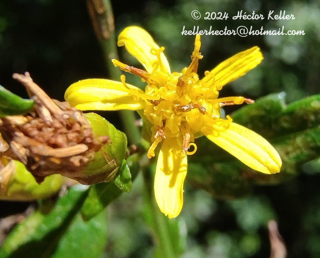 Subarbustos o arbustos escandentes, o lianas, hasta de 3,5 m de alto, con tallos muy ramificados, apoyantes o péndulos, subcilíndricos, costados, glabros. Hojas opuestas, pecioladas, con pecíolos de 0,5-1 cm de largo; láminas ovadas o subtriangulares, de 2,5-4,5 × 1-3 cm, base cuneada, truncada o redondeada, ápice agudo o acuminado, margen subentero, aserrado o lobulado, glabras en ambas superficies o raramente algo escabrosas en la haz. Capítulos heterógamos, radiados, en cimas umbeliformes terminales y axilares, pedunculados, con pedúnculos de 1,5-4 cm de largo, glabros. Involucro acampanado, de 8-9 × 8-9 mm; filarios 4-5-seriados, imbricados, los externos ovados, ca. 6 × 3,5 mm, ápice obtuso, margen entero o ciliado, glabros, los internos ovados u oblongos, ca. 7,5 × 2,5 mm, ápice redondeado, a veces agudo, margen ciliado, glabros. Receptáculo cónico, con páleas angostamente ovadas, ca. 6-8 mm de largo, conduplicadas, ápice atenuado, margen eroso o lacerado. Flores dimorfas, las del margen 5-10, pistiladas, con corola ligulada, de 7-8 mm de largo, amarilla, glabra, lígula obovada, ca. 4,5 × 2 mm, ápice 3-2-lobado; flores del centro numerosas, perfectas, con corola tubulosa, de 5,5-6 mm de largo, amarilla, glabra, 5-lobada, con lóbulos de 1,5-1,7 mm de largo. Aquenios angostamente obovoides u obpiramidales, de 2-2,3 × 0,3-0,5 mm, negros o castaños, glabros o glabrescentes. Papus formado por 12-18 páleas lineares o angostamente elípticas, ca. 3,8 mm de largo, ápice agudo o aristiforme, margen eroso, membranáceo.