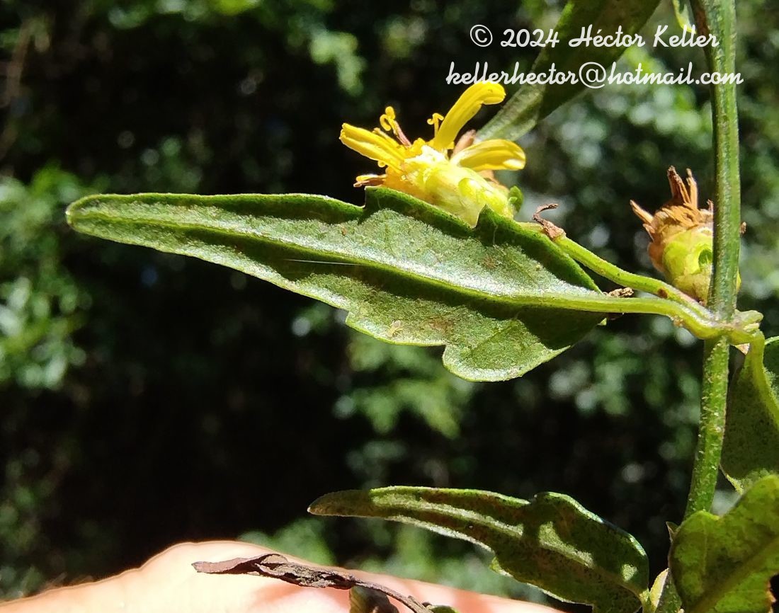 Subarbustos o arbustos escandentes, o lianas, hasta de 3,5 m de alto, con tallos muy ramificados, apoyantes o péndulos, subcilíndricos, costados, glabros. Hojas opuestas, pecioladas, con pecíolos de 0,5-1 cm de largo; láminas ovadas o subtriangulares, de 2,5-4,5 × 1-3 cm, base cuneada, truncada o redondeada, ápice agudo o acuminado, margen subentero, aserrado o lobulado, glabras en ambas superficies o raramente algo escabrosas en la haz. Capítulos heterógamos, radiados, en cimas umbeliformes terminales y axilares, pedunculados, con pedúnculos de 1,5-4 cm de largo, glabros. Involucro acampanado, de 8-9 × 8-9 mm; filarios 4-5-seriados, imbricados, los externos ovados, ca. 6 × 3,5 mm, ápice obtuso, margen entero o ciliado, glabros, los internos ovados u oblongos, ca. 7,5 × 2,5 mm, ápice redondeado, a veces agudo, margen ciliado, glabros. Receptáculo cónico, con páleas angostamente ovadas, ca. 6-8 mm de largo, conduplicadas, ápice atenuado, margen eroso o lacerado. Flores dimorfas, las del margen 5-10, pistiladas, con corola ligulada, de 7-8 mm de largo, amarilla, glabra, lígula obovada, ca. 4,5 × 2 mm, ápice 3-2-lobado; flores del centro numerosas, perfectas, con corola tubulosa, de 5,5-6 mm de largo, amarilla, glabra, 5-lobada, con lóbulos de 1,5-1,7 mm de largo. Aquenios angostamente obovoides u obpiramidales, de 2-2,3 × 0,3-0,5 mm, negros o castaños, glabros o glabrescentes. Papus formado por 12-18 páleas lineares o angostamente elípticas, ca. 3,8 mm de largo, ápice agudo o aristiforme, margen eroso, membranáceo.
