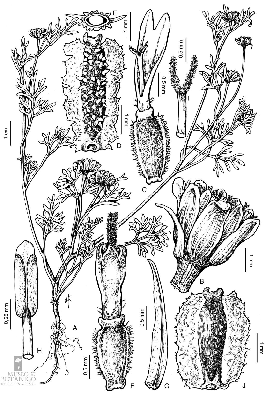 Hierbas anuales, con varios tallos tendidos desde abajo, de 10-40 cm de largo, glabros. Hojas basales arrosetadas, con pecíolos hasta de 8 cm de largo y láminas de contorno ovado, 2- 3-pinnatisectas, con segmentos linear-lanceolados; hojas caulinares alternas, gradualmente menores. Capítulos solitarios en el extremo de las ramitas y axilares. Involucro acampanado, ca. 2,5 × 3,5 mm; filarios 2-seriados, oblongos, glabros. Receptáculo con páleas oblongo-lineares. Flores del margen pistiladas, con lígula oblongo-elíptica, de 1,5-2 mm de largo, entera o 2-dentada; flores del centro numerosas, perfectas, con corola tubulosa, ca. 2 mm de largo, 4-5-lobada. Aquenios dimorfos: los del margen cilíndricos-humeriformes, ca. 3 mm de largo, sin alas, con el cuerpo liso o rugoso, los del disco elípticos, ca. 3,5 × 2 mm, comprimidos, lisos o algo rugosos; cuando isomorfos todos anchamente alados y comprimidos.