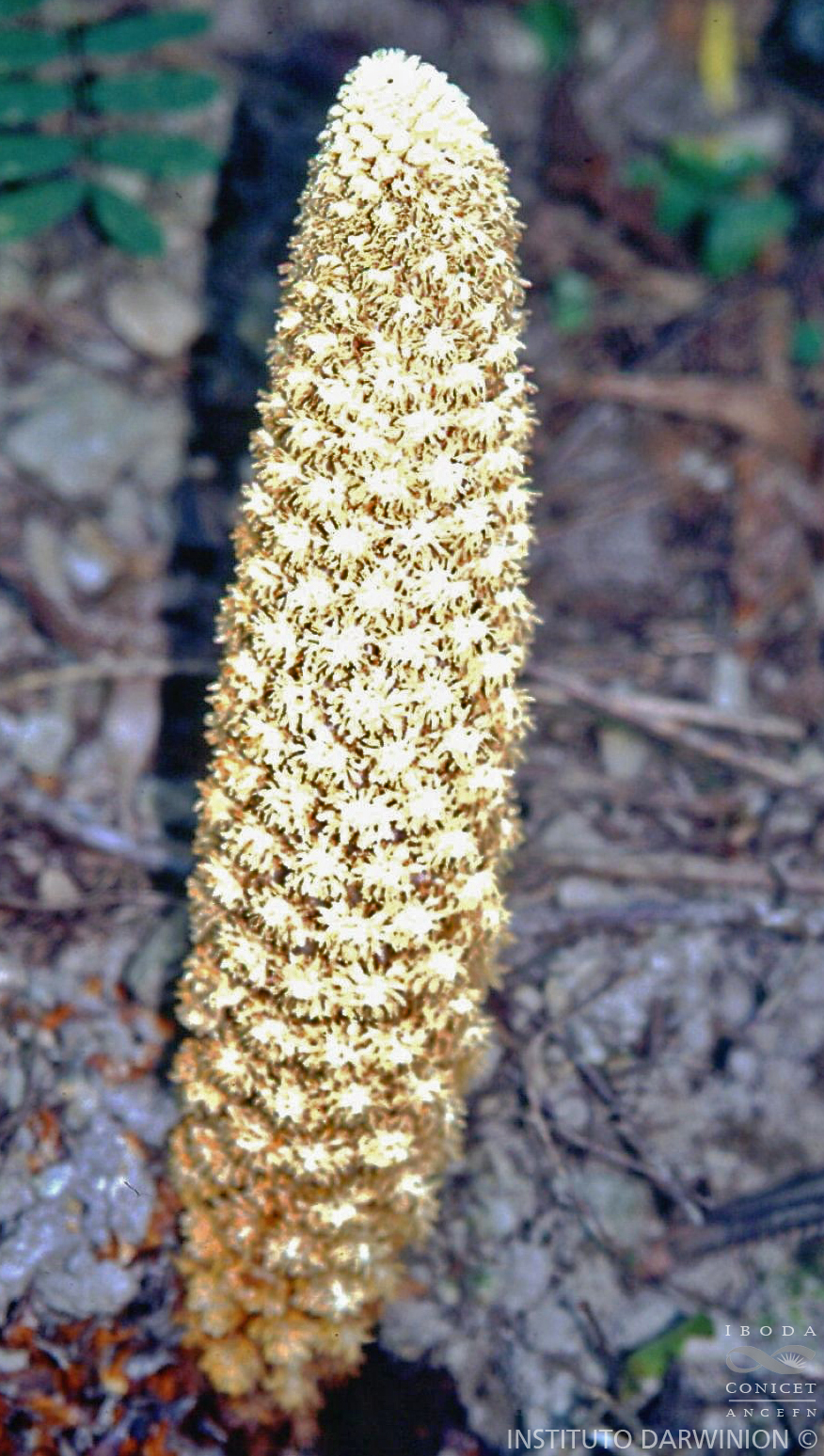 Plantas con tubérculos globosos o subcilíndricos, de 3-20 × 4-13 cm, superficie verrucosa. Inflorescencia de 8-20 cm de largo; espadicelas sustentadas por una bráctea escuamiforme y subpeltada. Flores estaminadas con el perigonio formado por una sola pieza; estambres 2, filamentos ca. 0,4 mm de largo, anteras 2-tecas, de 2,6-3,0 × ca. 0,7 mm, con tecas al mismo nivel entre sí, blanquecinas; ovario vestigial, rojizo. Flores pistiladas obcónicas-prismáticas, ca. 3,3 × 1,8; estilos 2, estigmas capitados; sin bractéolas.