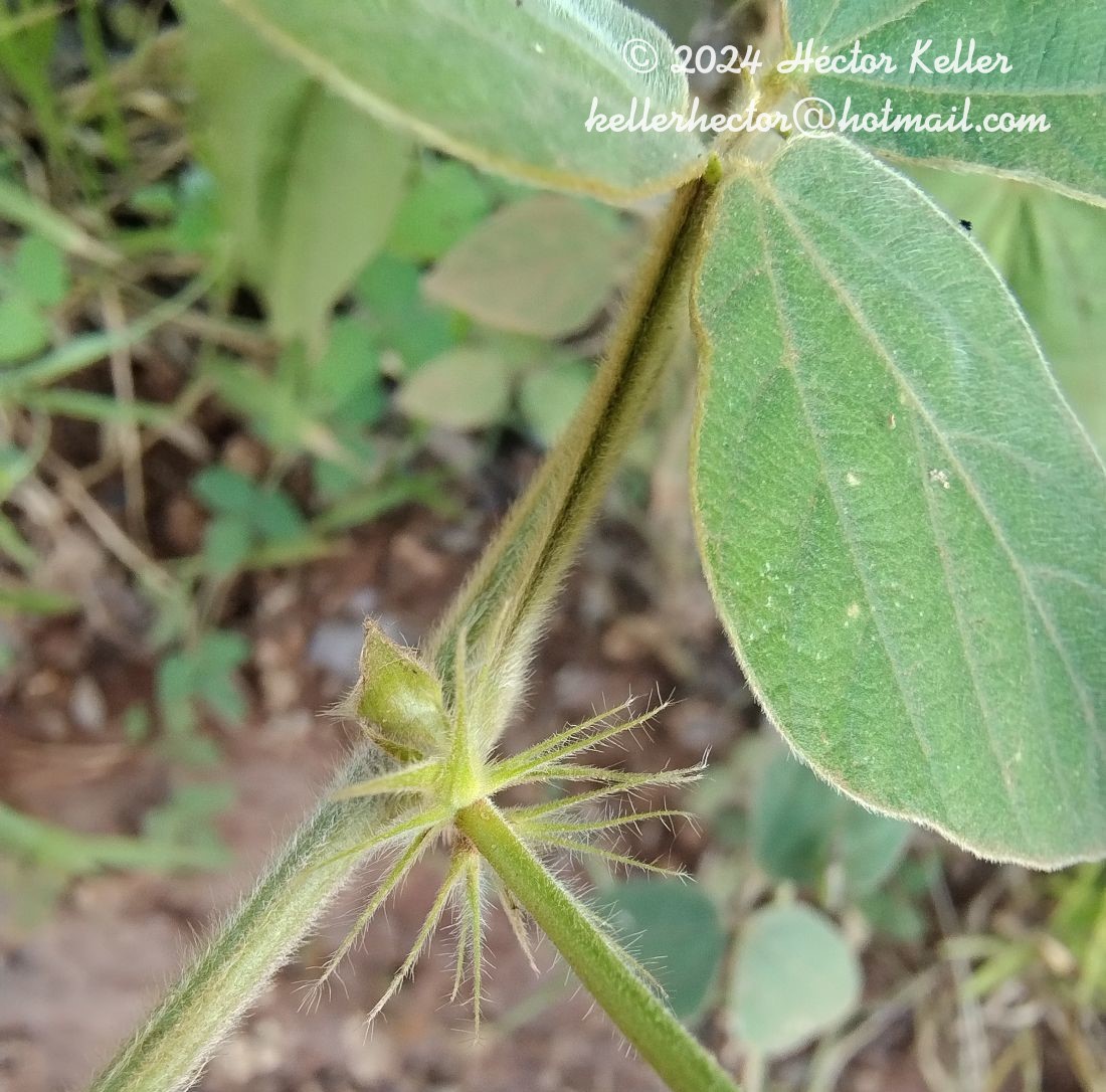 Planta herbácea, perenne, voluble, pubescente, con raiz axonomorfa leñosa. Estípulas ovales a angostamente ovadas o triangulares, 3,6 9, 2 mm long.; pecíolos vellosos, 30 50 mm long.; estipelas subuladas, 1,8 3 mm long.; folíolos ovados a romboidales, los laterales asimétricos a veces con lóbulos pronunciados, con notable pubescencia, en cara abaxial canescentes, 43 70 mm long. x 30 41 mm lat.. Inflorescencias, de 100-280 mm long., pedúnculo con un fascículo de bracteas subuladas con largos pelos amarillos a 6 11 mm de la base. Flores, 9 20 mm long., cáliz con pubescencia corta, 3,6 4,2 mm long., con los 5 dientes subiguales triangulares menores que el tubo. Estandarte verdoso 10 12 mm long., suborbicular, con hendidura pronunciada superior y prominentes aurículas globosas en la base, cuya zona está provista de pequeñas papilas, uña de 1.5 2 mm long.. Alas rosadas, 12 18 mm long., con larga uña y base del limbo acanalada donde engancha una prominencia de la quilla. Estambre vexilar algo ensanchado en la base, no geniculado, 10 11 mm long.. Ovario, 4 5 mm. long., pubescente, con disco nectarífero aneliforme; estigma subterminal debido a una prolongación lateral del estilo y bordeado de unas hileras de pelos en la porción inferior. Frutos arrimados al pedúnculo subfalcados a falcados, subcilindricos, 35 50 mm long., 4 8-seminados.