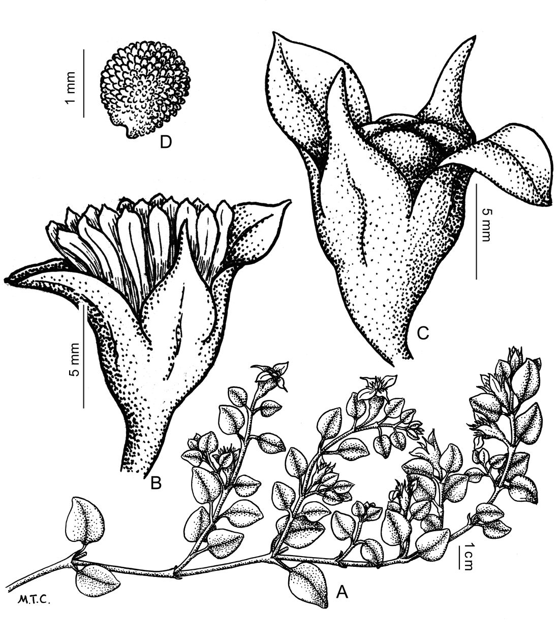 Hierbas perennes, carnosas; tallos muy ramificados; ramas rastreras, tetrágonas, de 30-60 cm de largo, rastreras, usualmente arraigadas en los nudos; entrenudos de 1-4 cm de largo. Hojas opuestas, pecioladas, ovado-cordadas, de 1-3 × 0,5-5 cm, planas, con pequeñas papilas; margen entero; base cordada; ápice agudo. Flores perfectas, solitarias, axilares; hipanto de 6-7 mm de largo; cáliz 4, porción libre de los sépalos de 2-4,8 mm de largo; estaminodios petaloides numerosos, rosados a purpúreos, de 3-4 mm de largo, reflejos; estaminodios filamentosos ausentes; estambres numerosos, erectos. Frutos cápsulas higrocásticas, de 13-15 mm de largo; valvas no aladas. Semillas suborbiculares, oscuras, tuberculadas.