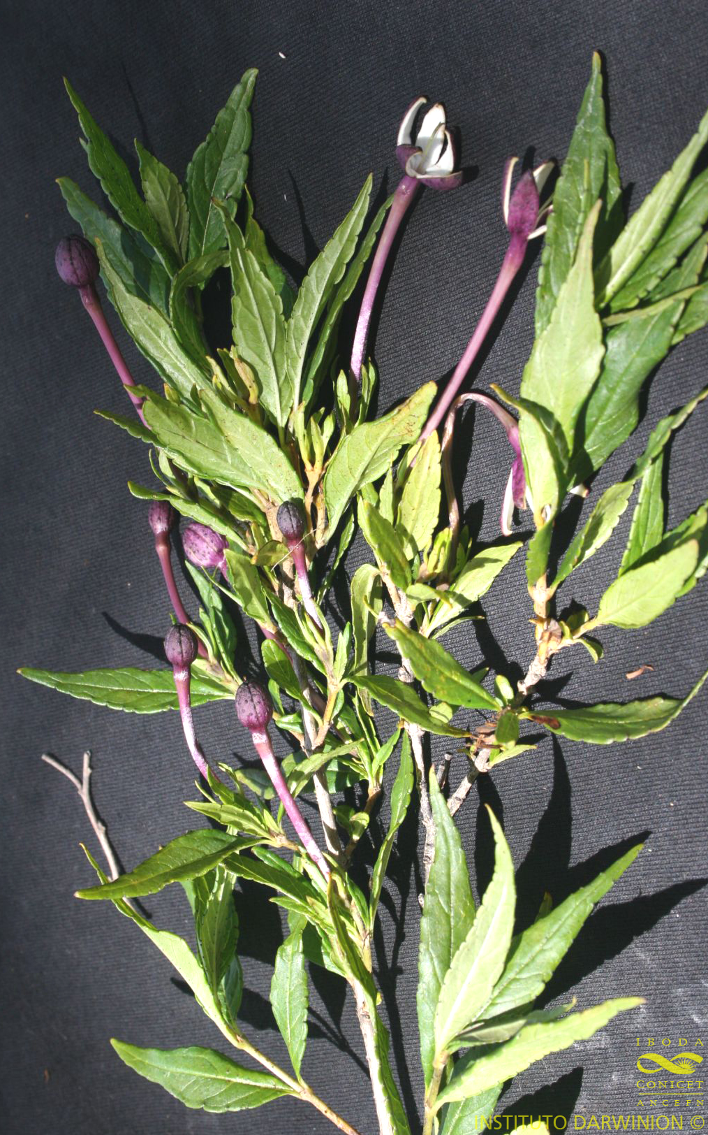 Arbusto de 2-3 m de alto, con ramas pubérulas en los entrenudos apicales. Hojas subsésiles, lanceoladas, de 40-60(-100) × 5-15(-20) mm, acuminadas, el borde crenado, glabras; estípulas interpeciolares, triangulares, de ápice agudo, entero o 2-fido, pubérulas, persistentes. Inflorescencia terminal cimosa, corimbiforme, de 2-6 flores alternas, brevemente pediceladas, ejes y pedicelos pubérulos; brácteas aleznadas, pubérulas, persistentes. Flores con el cáliz con (4-)5-7 lóbulos espatulados, ligeramente desiguales entre sí, acuminados, foliáceos, pubérulos, acrescentes en el fruto; corola 5(-7)-lobada, de 50-65 mm de largo, rojizo-purpúrea por fuera, blanca en su interior, en las flores longistilas con tubo corolino dilatado hacia el ápice, y en su interior con estambres y un anillo denso de pelos, en las brevistilas con estambres exertos, ligeramente más largos, tubo corolino gradualmente ensanchado hacia el ápice, glabro en su interior; en ambas flores, y por debajo de la inserción de los estambres, el tubo corolino es glabro en una franja y en el resto presenta pelos laxos, más cortos hacia la base. Fruto una cápsula subglobosa, de 10-12 mm de diámetro, valvas de ápice entero. Semillas lenticulares, de 4 mm de diámetro, con ala marginal de borde laciniado, cara hilar convexa, glabra, cara dorsal, subplana, pubérula; embrión con cotiledones ovados.