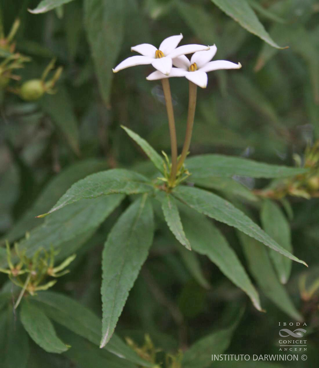 Arbusto de 2-3 m de alto, con ramas pubérulas en los entrenudos apicales. Hojas subsésiles, lanceoladas, de 40-60(-100) × 5-15(-20) mm, acuminadas, el borde crenado, glabras; estípulas interpeciolares, triangulares, de ápice agudo, entero o 2-fido, pubérulas, persistentes. Inflorescencia terminal cimosa, corimbiforme, de 2-6 flores alternas, brevemente pediceladas, ejes y pedicelos pubérulos; brácteas aleznadas, pubérulas, persistentes. Flores con el cáliz con (4-)5-7 lóbulos espatulados, ligeramente desiguales entre sí, acuminados, foliáceos, pubérulos, acrescentes en el fruto; corola 5(-7)-lobada, de 50-65 mm de largo, rojizo-purpúrea por fuera, blanca en su interior, en las flores longistilas con tubo corolino dilatado hacia el ápice, y en su interior con estambres y un anillo denso de pelos, en las brevistilas con estambres exertos, ligeramente más largos, tubo corolino gradualmente ensanchado hacia el ápice, glabro en su interior; en ambas flores, y por debajo de la inserción de los estambres, el tubo corolino es glabro en una franja y en el resto presenta pelos laxos, más cortos hacia la base. Fruto una cápsula subglobosa, de 10-12 mm de diámetro, valvas de ápice entero. Semillas lenticulares, de 4 mm de diámetro, con ala marginal de borde laciniado, cara hilar convexa, glabra, cara dorsal, subplana, pubérula; embrión con cotiledones ovados.