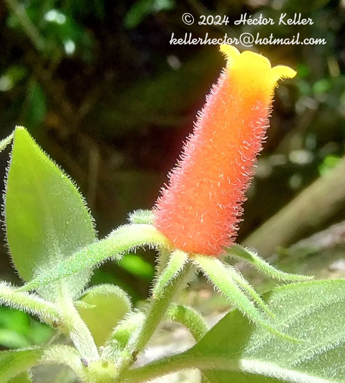Trepadora; tallos subtetrágonos o 4-gonos, de 1-2,5 mm de diámetro, estriados, pubescentes o pubérulos. Hojas con la lámina ovada o elíptica, de 3-10 × 1-4,8 cm, ápice agudo o acuminado, base aguda, cara adaxial glabra o pubescente, margen glabro, membranáceas o papiráceas, nervios secundarios visibles en la cara abaxial; pecíolos subcilíndricos, de 5-25 mm de largo, pubescentes, pubérulos o tomentosos; estípulas triangulares, de 2-4 × 1,5-2 mm, ápice agudo o acuminado, pubescentes. Inflorescencias en monocasio. Flores con pedicelos de 10-39 mm de largo, pubescentes; cáliz 4-lobado; hipanto obovoide, de 2-5 × 1,5-3,5 mm, pubescente o tomentoso; lóbulos ovado-lanceolados, ovados, o elípticos, de 5-15 × 0,5-8,5 mm, subulados, reflexos, pubescentes; corola tubulosa, de 8-18 mm de largo, con la base ensanchada, exteriormente tomentosa, roja a gradualmente amarillenta hacia el ápice; lóbulos triangulares, de 1,5-2 × 1-3 mm, internamente glabros, patentes; interior del tubo de la corola con un anillo de pelos cerca de la base, el resto glabro, ápice del botón cilíndrico y obtuso; estilo filiforme, de 2-15 mm de largo, incluso a parcialmente exerto, glabro, estigma 2-lobado; estambres inclusos o subinclusos; anteras oblongas, de 1,5 × 1 mm de largo. Fruto una cápsula, obovoide o elipsoide, de 4-15 × 3,5-8 mm, pubescente; pedicelo de 10-60 mm de largo. Semillas de contorno irregularmente orbicular, de 1-2 × 1-2 mm.