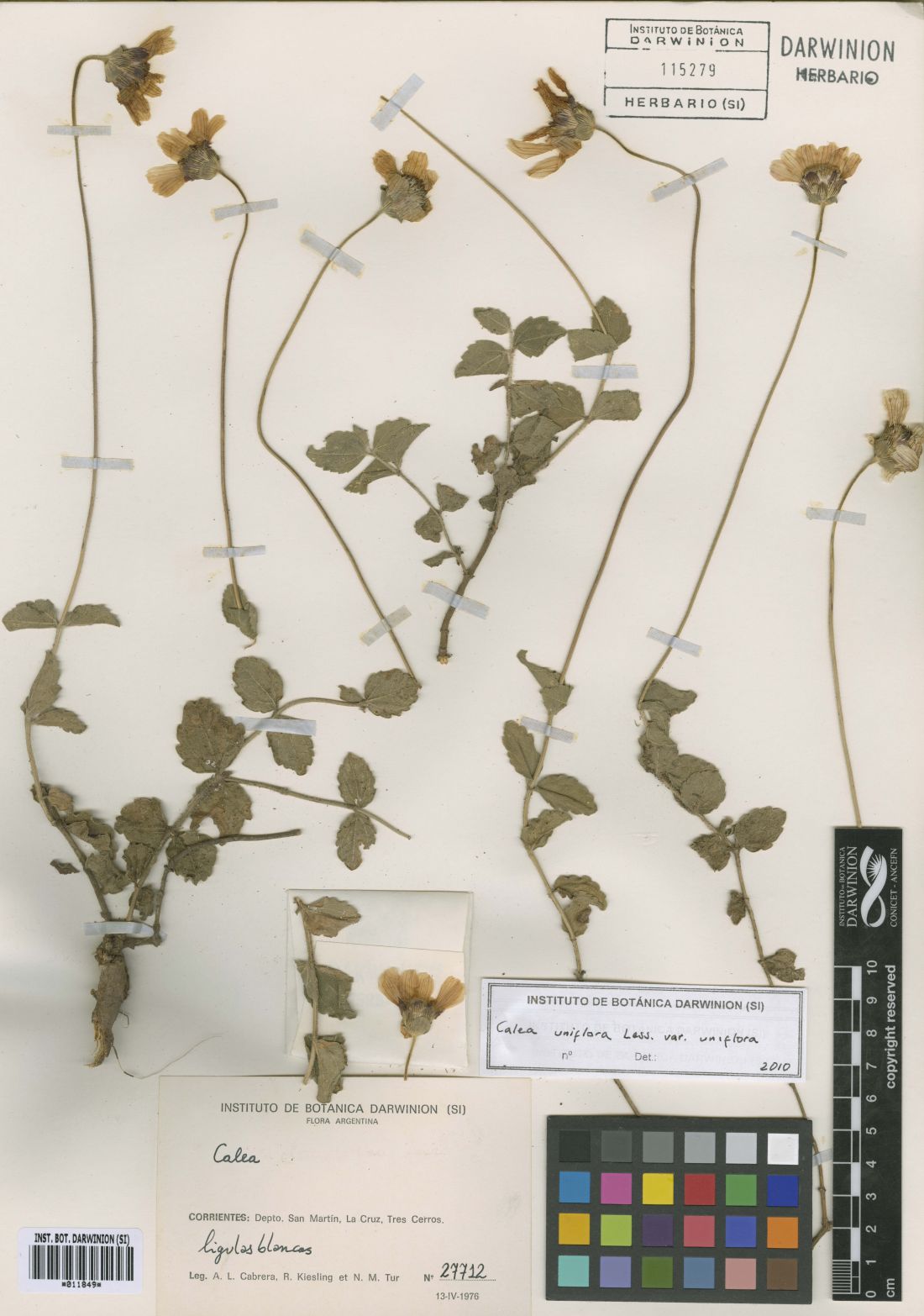 Hierbas perennes, de 20-40 cm de alto, con xilopodio y tallos ascendentes, poco ramificados en la base, hojosos en su mitad inferior, hirsutos. Hojas opuestas, sésiles o con pecíolos breves, de 2-3 mm de largo; láminas ovadas, de 1,5-5 × 0,8-3 cm, base redondeada o cuneada, ápice agudo, margen aserrado, pubescentes o hirsutas en ambas superficies. Capítulos heterógamos u homógamos, radiados o discoides, solitarios en los extremos de las ramas, largamente pedunculados, con pedúnculo de 12-26 cm de largo, pubescentes. Involucro hemisférico, de 10-15 × 14-20 mm; filarios 3-4-seriados, imbricados, los externos anchamente elípticos, de 5-10 × 5-8 mm, ápice obtuso o redondeado, pubescentes, los internos oblongos, de 7-14 × 3,5-5 mm, ápice obtuso, margen eroso, glabros. Receptáculo cónico, con páleas dimorfas, las externas escuamiformes, ca. 10 × 2,5 mm, ápice aristado, margen lacerado o eroso, las internas lineares o angostamente elípticas, ca. 10 × 0,5-1 mm, ápice aristado, subulado, margen inferior eroso, membranoso. Flores dimorfas o isomorfas, las del margen, cuando presentes, 8-15, pistiladas, con corola ligulada, de 20-30 mm de largo, amarilla o a veces blanca, glabra, lígula oblonga, ca. 20 × 5 mm, ápice 4-lobado; flores del centro numerosas, perfectas, con corola tubulosa, de 7-8 mm de largo, amarilla o amarillo-anaranjada, glabra, 5-lobada, con lóbulos ca. 1,5 mm de largo. Aquenios obpiramidales u obcónicos, de 2,5-3 × 1-1,3 mm, negros o castaños, levemente pubescentes. Papus formado por 16-22 páleas lineares o angostamente ovadas, de 5-7 mm de largo, por debajo de los lóbulos de la corola de las flores tubulosas, membranáceas, ápice atenuado, aristiforme, márgen eroso.