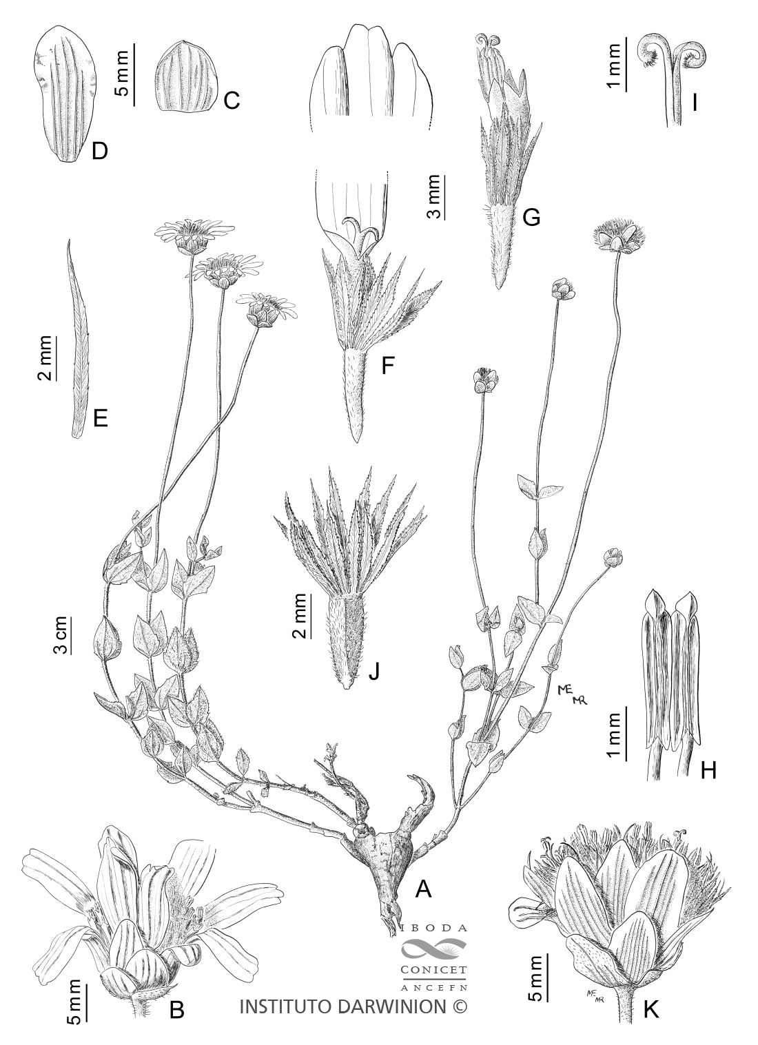 A. Planta. B. Capítulo radiado. C. Filario externo. D. Filario interno. E. Pálea interna. F. Flor del margen. G. Flor del centro. H. Estambres. I. Parte superior del estilo. J. Aquenio y papus. Calea uniflora var. discoidea. K. Capítulo discoide.