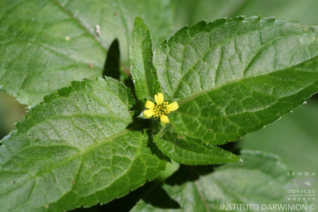 Hierbas anuales, de 40-80 cm de alto, con tallos erectos, ramificados, pubescentes en las partes jóvenes. Hojas opuestas, pecioladas; láminas ovadas, de 3-8 × 2-4,5 cm, redondeadas o acorazonadas en la base, a veces algo decurrentes en un pecíolo apenas alado, agudas en el ápice, aserrado-dentadas, con 3 nervios más notables, laxamente pubescentes, con pelos aplicados de base algo tuberculada. Capítulos pedunculados, agrupados en corto número en la axila de las hojas superiores o terminales. Involucro acampanado, de 5-7 × 3-5 mm; filarios pocos, ca. 5, 1-seriados, ovados, obtusos, con el dorso piloso. Receptáculo con páleas lanceoladas, angostas, membranáceas. Flores del margen 6-7, pistiladas, con lígula amarilla, oblonga u obovada, de 4-5 mm de largo, que casi alcanza la altura del involucro; flores del centro pocas, perfectas, con corola tubulosa, de 4-5 mm de largo. Aquenios de 4-6 × 1-2 mm, los del margen subtrígonos, 3-aristados, los del centro oblongos, algo comprimidos, lisos o algo rugosos. Papus formado por 2 aristas desiguales, hasta de 2 mm de largo, unidas en la base por un anillo eroso.