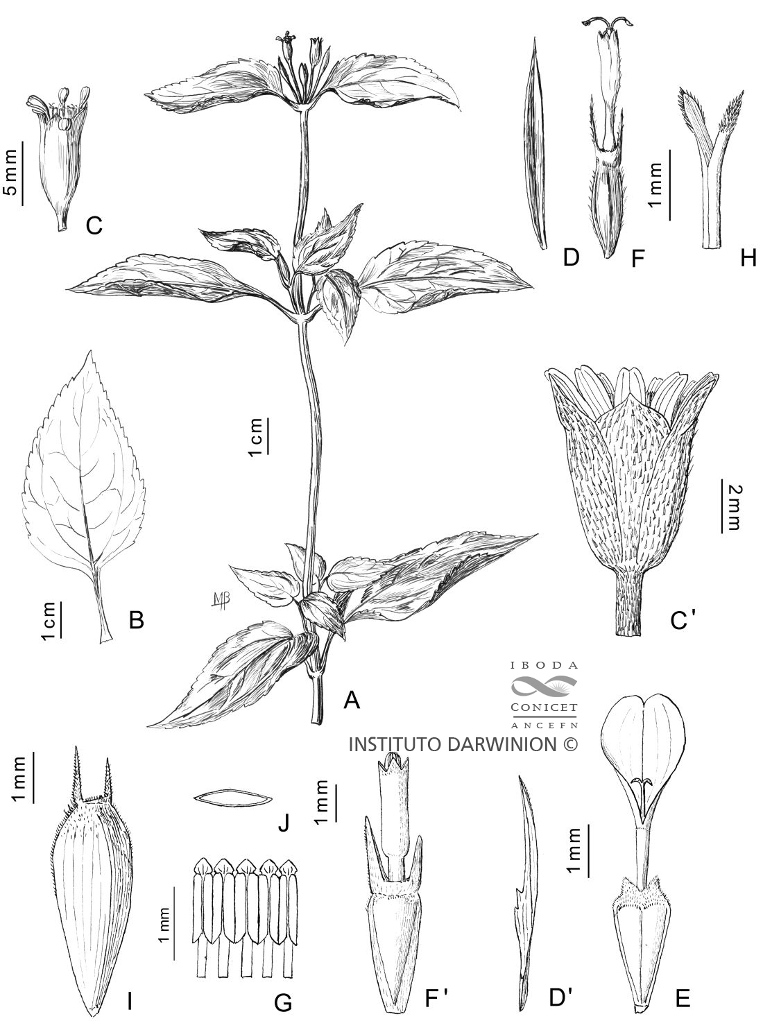 Hierbas anuales, de 40-80 cm de alto, con tallos erectos, ramificados, pubescentes en las partes jóvenes. Hojas opuestas, pecioladas; láminas ovadas, de 3-8 × 2-4,5 cm, redondeadas o acorazonadas en la base, a veces algo decurrentes en un pecíolo apenas alado, agudas en el ápice, aserrado-dentadas, con 3 nervios más notables, laxamente pubescentes, con pelos aplicados de base algo tuberculada. Capítulos pedunculados, agrupados en corto número en la axila de las hojas superiores o terminales. Involucro acampanado, de 5-7 × 3-5 mm; filarios pocos, ca. 5, 1-seriados, ovados, obtusos, con el dorso piloso. Receptáculo con páleas lanceoladas, angostas, membranáceas. Flores del margen 6-7, pistiladas, con lígula amarilla, oblonga u obovada, de 4-5 mm de largo, que casi alcanza la altura del involucro; flores del centro pocas, perfectas, con corola tubulosa, de 4-5 mm de largo. Aquenios de 4-6 × 1-2 mm, los del margen subtrígonos, 3-aristados, los del centro oblongos, algo comprimidos, lisos o algo rugosos. Papus formado por 2 aristas desiguales, hasta de 2 mm de largo, unidas en la base por un anillo eroso.
