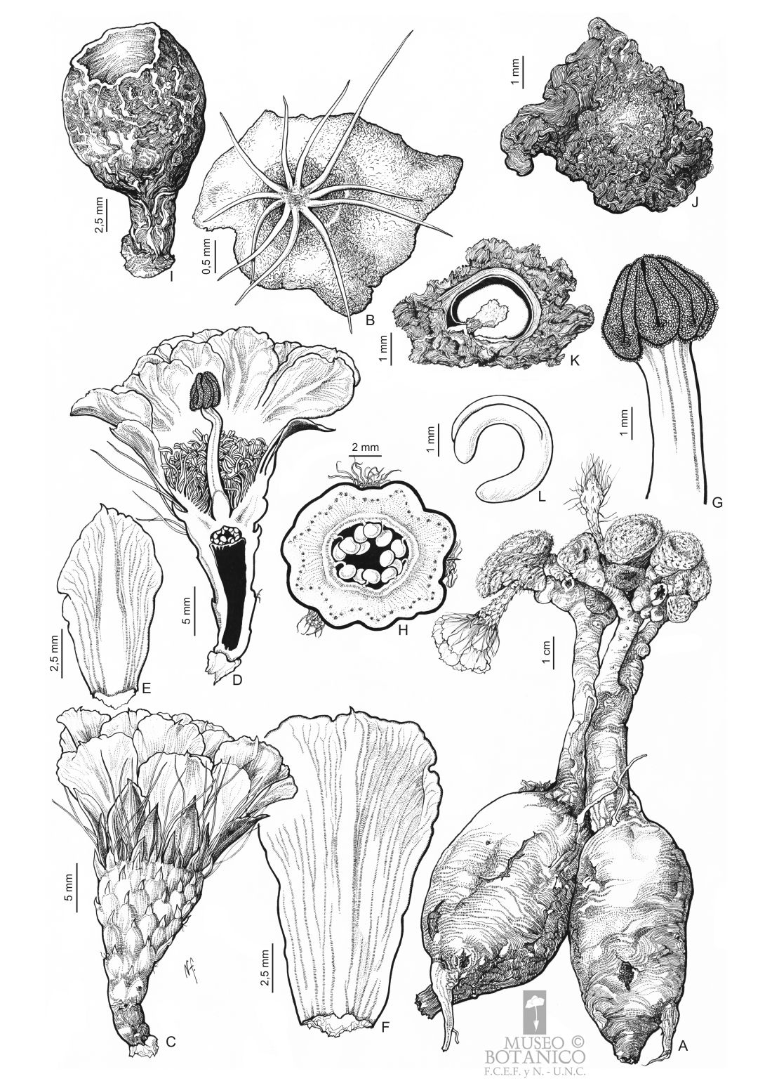 A. Hábito. B. Aréola. C. Flor, vista lateral. D. Corte longitudinal por flor. E-F. Pétalos. G. Parte superior del estilo y estigma. H. Transcorte por ovario. I. Fruto. J. Semilla, vista lateral. K. Corte longitudinal por semilla. L. Embrión .
