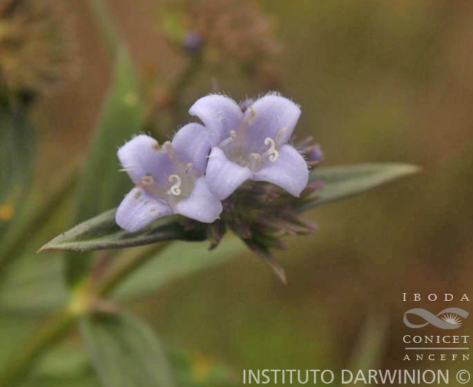 Sufrútice erecto o decumbente, de 15-65 cm de alto, amarillento al secarse, con xilopodio; tallos ramificados desde la base, ramas floríferas distales 1-3 divididas, 4-gono, glabro, pubérulo o con pelos sobre los ángulos, verdoso o vináceo. Hojas sésiles, oblongas o elípticas, de 40-70 × 10-20 mm, generalmente coriáceas o papiráceas, pubescentes o con pelos sobre los nervios en el envés, raro glabras, con 3-6 pares de nervios secundarios plegado-nervosos, ápice agudo y base atenuada. Vaina estipular subtriangular, de 3-5 mm de largo, glabra o de indumento variable; lacinias 3, de 1-12 mm de largo, la central siempre más larga, glabras o pubescentes. Inflorescencias con 1 glomérulo apical y 2-4 glomérulos axilares, esféricos, de 15-22 mm de ancho, multifloros, eje florífero siempre con crecimiento definido; brácteas 2-4, ovadas, más largas que el diámetro del glomérulo. Flores 4-meras, sésiles; hipanto turbinado u ovado, de 3-4 mm de largo, glabro o pubescente; cáliz 4-partido, lóbulos linear-lanceolados, de 4-7 mm de largo, glabros o con márgenes pubescentes y dorso carenado; corola infundibuliforme, de (8-)10-15 mm de largo, violácea, externamente glabra, con papilas en el dorso de los lóbulos, internamente con un anillo denso de pelos moniliformes en el tercio inferior del tubo y densamente en la base de los lóbulos; estambres con anteras de 1-2 mm de largo, blanquecinas o azuladas; estilo de 10-17 mm de largo; estigma 2-fido, ramas estigmáticas enrolladas. Fruto una cápsula sésil o subsésil, ovoidea o subglobosa, de 4-5 × 4-6 mm, glabra, valvas dehiscentes. Semillas subglobosas, de contorno elíptico u obovado, de 2,5-4 × 1-1,5 mm, castaño -oscuras, cara dorsal convexa, cara ventral plana con surco profundo, estrofíolo caedizo, rafidios dispersos; exotesta retículo-foveada.
