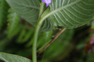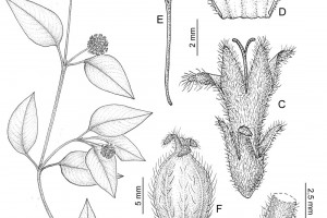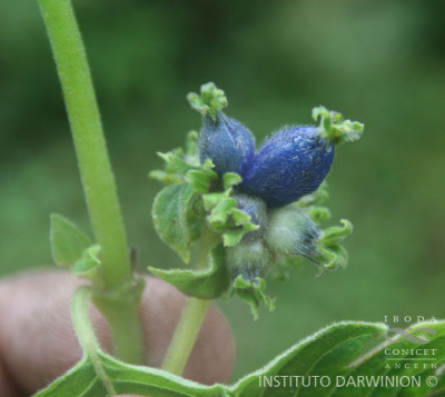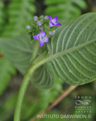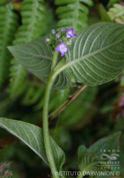 Hierba o sufrútice rastrero; tallos radicantes, con pelos largos, blandos, adpresos o erectos, blanquecinos. Hojas con láminas ovado-elípticas, de 40-90 × 20-35 mm, ápice agudo y base redondeada, truncada, obtusa o levemente asimétrica, pelos adpresos, velutinos, más densos sobre los nervios en el envés, con 8-10 nervios secundarios; estípula de 1 mm de largo, con una fimbria linear de 2,5-3 mm de largo, vilosa; pecíolo de 10-20 mm de largo, viloso o velutino. Inflorescencias globosas, de 10-20 mm de diámetro, con 10-20 flores, axilares, subsésiles o pedunculadas. Flores con cáliz 4-lobulado; hipanto turbinado, velutino, con pelos adpresos o erectos; lóbulos oblongo-elípticos, de 2,5-3 mm de largo, reflexos en el fruto; corola de 6-7,2 mm de largo, la superficie externa pubescente o velutina, tubo lilacino o blanco-verdoso con lóbulos blanquecinos o lilacinos; flores longistilas con anteras de 1,5 mm de largo, filamento nulo, estilo de 6,5-7(-7,2) mm de largo; flores brevistilas con anteras de 1,5 mm de largo, filamentos de 1-1,5 mm de largo, estilo de 3-4 mm de largo. Fruto una baya de contorno ovado-oblonga, de 12-30 mm de largo, azul brillosa, con pelos dispersos, lóculos 14-15-seminados. Semilla de 1,3-1-4 mm de largo, verrucosa.