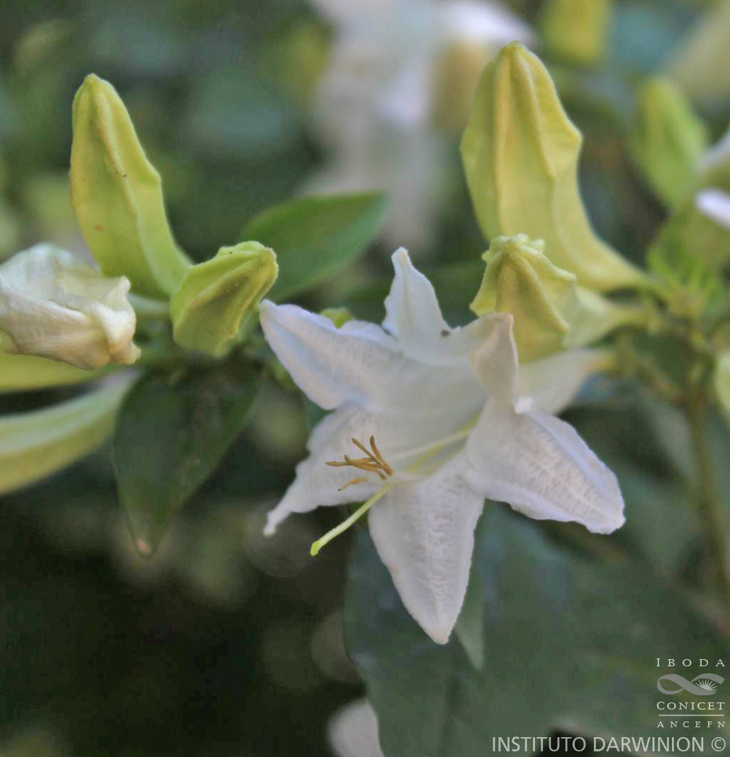 Árbol o arbusto de 2 m de alto, a veces árboles apoyantes; ramas con lenticelas, glabras o pubérulas. Hojas con láminas ovadas, oblongas o elípticas, de (5-)6,6-10,5 × (2-)2,8-5,2 cm, base atenuada, ápice agudo, papiráceo-cartáceas, pubescentes con indumento más denso sobre las venas y venillas; 6-7 venas secundarias, domacios en mechón de pelos; pseudopecíolos de 7-9 mm de largo, acanalados, pubérulos; estípulas interpeciolares de 3-4 mm de largo. Inflorescencias cimosas terminales, a veces axilares; brácteas foliáceas lineares, de 10-12 mm de largo; bractéolas filiformes, de 4 mm de largo. Flor con pedicelo de 5-7 mm de largo; hipanto pubescente; cáliz con 6 lóbulos lineares, de 17-19 mm de largo; corola de 48-69 mm de largo, rosada a lila o blanca con el centro rosa, externamente pubescente y con el tubo corolino arqueado; estambres 6, adnatos en la base de la corola, filamentos de 40-43 mm de largo, pubérulos; anteras de 12-15 mm de largo, basifijas; estilo filiforme, de 62-66 mm de largo, estigma 2-lobado-capitado, glabro. Fruto una cápsula de contorno obovado, de 14-27 mm de largo, lateralmente comprimida, sin lenticelas, coriáceas, pubescente, con el cáliz persistente, castañas a negras. Semillas elipsoideo-ovoideas, de 7-8 × 5-6 mm, aladas.