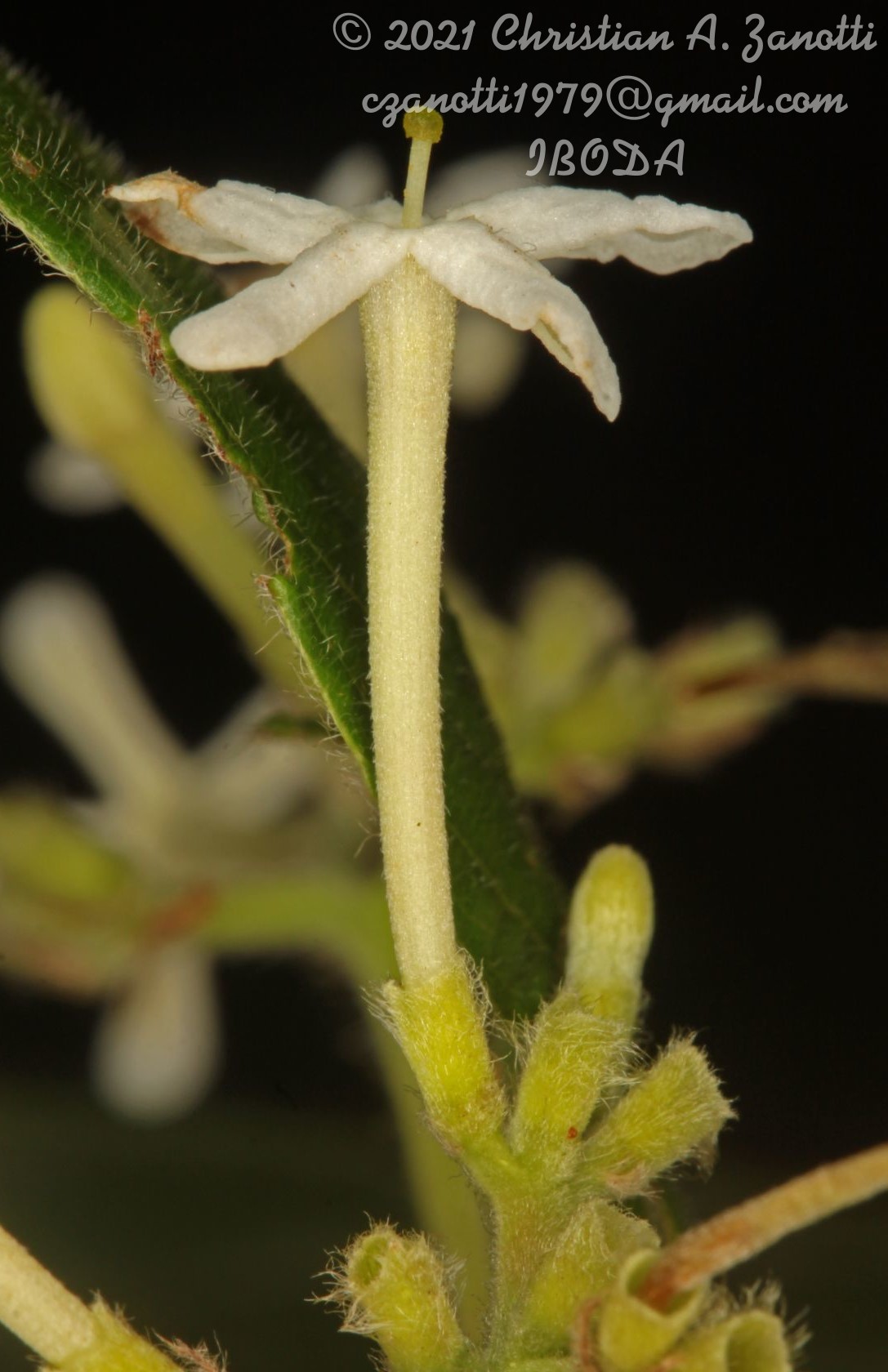Arbolitos de 3-12 m de alto, erectos a escandentes, corteza lisa, oscura; ramas jóvenes vilosas en el ápice, aguzadas como espinas. Hojas elíptico-lanceoladas a ovadas, ovado-oblongas u obovadas, de 4,5-9(-13) × 2-5 cm, ápice agudo o acuminado, base atenuada u obtusa, haz verde lustrosa, con pubescencia laxa, envés blanco-grisáceo con pelos largos erectos y pelos cortos adpresos, pecíolos vilosos; estípulas triangulares u ovales, de 4-10 mm de largo, ápice acuminado, cara externa vilosa, cara interna glandulosa, con pubescencia serícea, coléteres presentes. Inflorescencia cimosa, contraída en forma de glomérulo, con 3-40 flores, pedunculada, raquis secundarios pubescentes. Flores perfectas, dístilas, blanco-rosadas, fragantes, sésiles; brácteas lineares, iguales o sobrepasando algo el cáliz, persistentes o tardíamente caducas; cáliz e hipanto de 2-3,5 mm de largo, con pubescencia velutina que disminuye en densidad hacia el borde; cáliz tubular, truncado, el borde denticulado, superficie interior glabra o con pelos largos en su base y fina pubescencia hacia el borde; corola 4-5(-6-7)-lobada, de 11-19 mm de largo, blanca o rosada, prefloración imbricada o quincuncial, externamente con pubescencia adpreso-serícea, con pelos más largos en el dorso de los lóbulos, internamente glabra, con escasos pelos en la base de los lóbulos; anteras subsésiles, de 2,5-3,5 mm de largo; ovario 2-4(-3-6) locular; disco entero densamente pubescente; estilo glabro, capitado, 2-4-lobado. Fruto una drupa elipsoide, de 9-14 × 4-6 mm, tomentosa, velutina, el cáliz persistente. Semilla con arilo blanco.