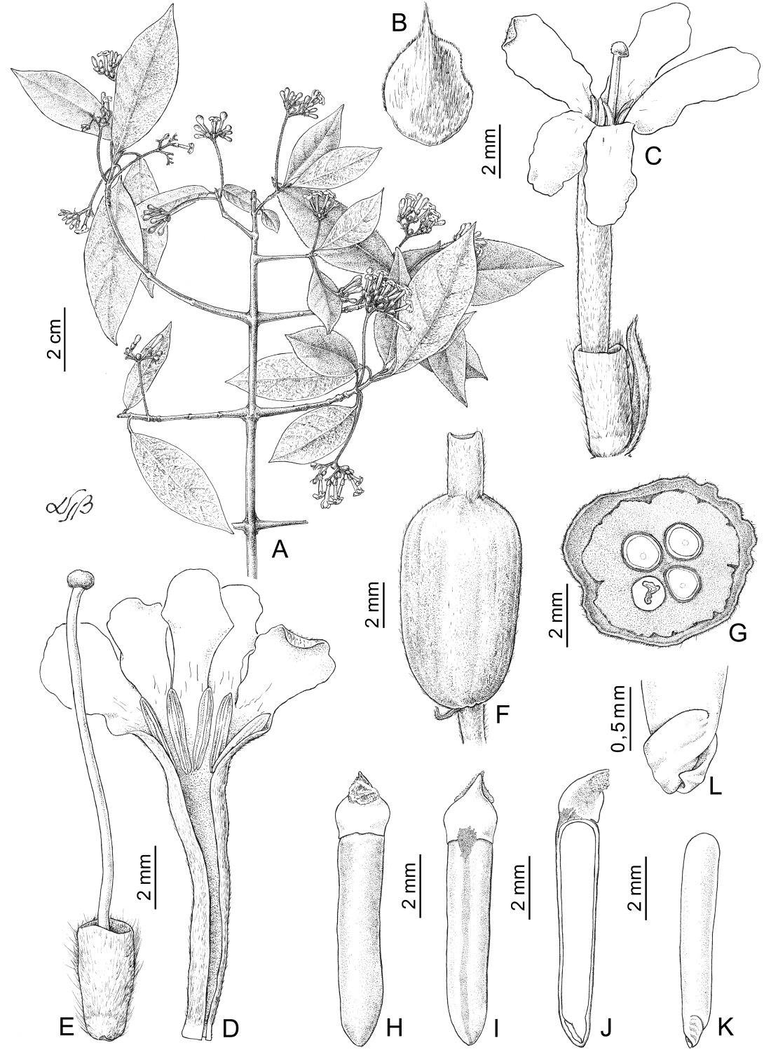 A. Rama florífera. B. Lóbulo de la estípula. C. Flor perfecta con bractéola basal. D. Corola desplegada y androceo. E. Hipanto, estilo y estigma. F-G. Drupa, vista lateral y corte transversal, respectivamente. H-J. Semilla, caras ventral y dorsal y corte longitudinal, respectivamente. K. Embrión. L. Detalle de los cotiledones.