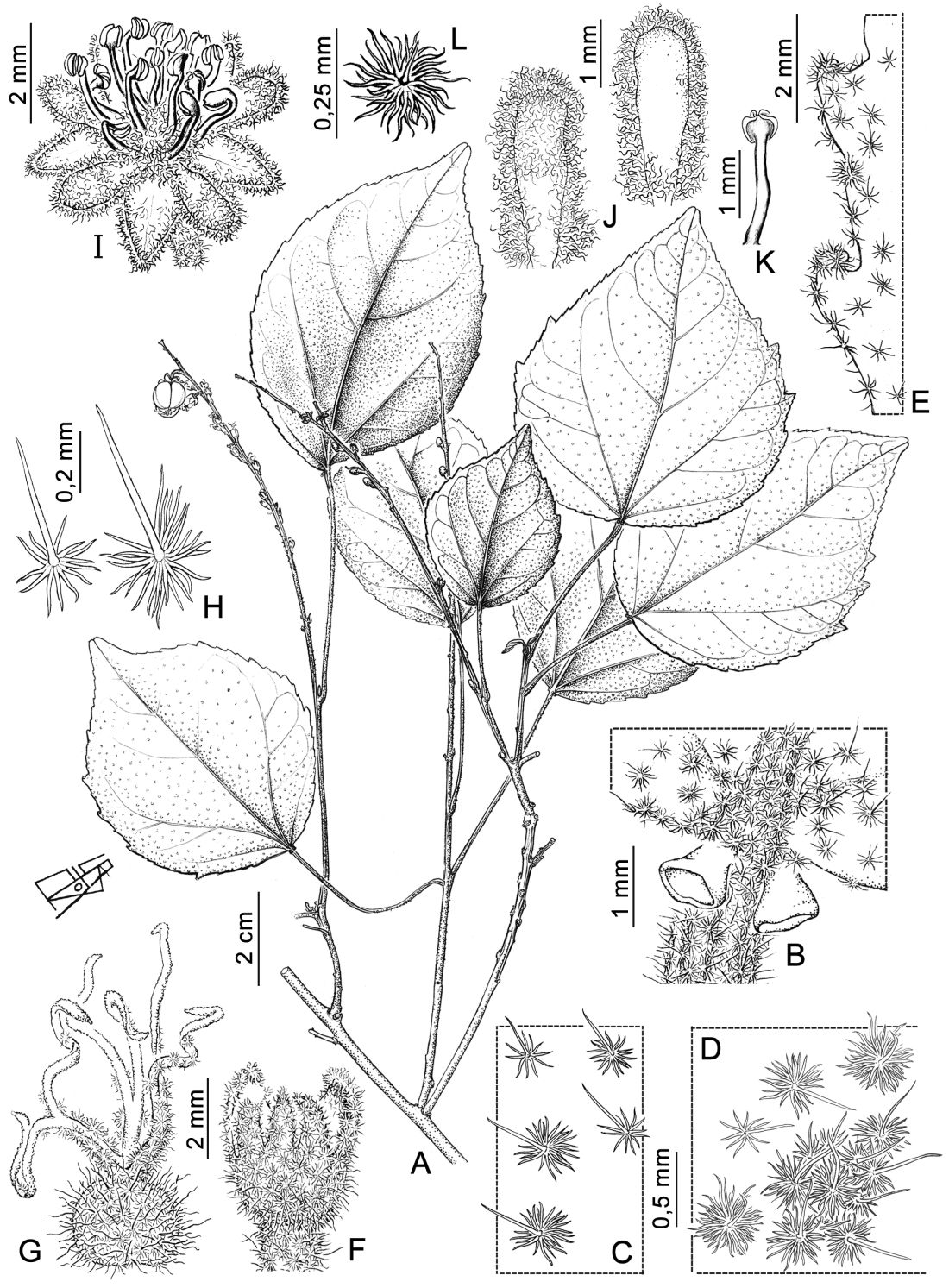 A. Planta. B. Glándulas acropeciolares. C. Detalle de los tricomas del haz foliar. D. Detalle de los tricomas del envés foliar. E. Margen foliar con coléteres en los ápices de los dientes. F. Flor pistilada. G. Gineceo. H. Tricomas del haz foliar. I. Flor estaminada. J. Pétalos de la flor estaminada. K. Estambre. L. Tricoma del cáliz estaminado, lado externo.