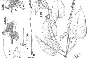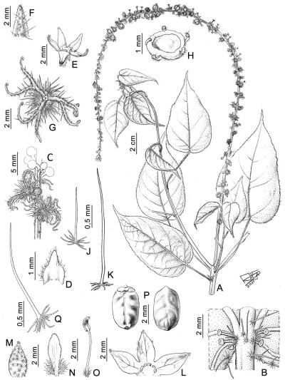 Arbustos monoicos de 1-4 m de alto, a menudo ramificados desde la base, con tricomas densos estrellado-porrectos con el radio central hasta de 2 mm de largo en las partes jóvenes; ramas cilíndricas, con tricomas laxos. Hojas alternas; pecíolos de 2,5-15 cm de largo, con 2(-6) glándulas cilíndricas o con ápice pateliforme y estípite de 0,5-1 mm de largo, dispuestas en la cara abaxial o bien en la unión con la lámina o en la base de la lámina junto al nervio central; estípulas casi obsoletas: láminas ovadas, ovado-oblongas o cordadas, de 5-15 × 2,5-10 cm, membranáceas, con 5-8 pares de nervios de cada lado de la nervadura central, ápice acuminado, base redondeada a cordada, margen ciliado-denticulado con tricomas estrellado-porrectos dispersos a densos en la cara abaxial, subglabras en la cara adaxial o con tricomas a lo largo de los nervios. Inflorescencias espiciformes a racemiformes, terminales, gráciles, 2-sexuales, de 6-30 cm de largo, erguidas a nutantes, con numerosas flores densas dispuestas en címulas 2-sexuales en la base y címulas exclusivamente estaminadas en el ápice. Flores estaminadas con pedicelo de 1,5-3 mm de largo; sépalos 5, triangulares, ca. 2 mm de largo; pétalos 5, oblongos, de 2-2,5 mm de largo, ápice agudo; receptáculo viloso; estambres 16-23, filamentos de 2,5-3 mm de largo. Flores pistiladas subsésiles; pedicelo hasta de 1 mm de largo; bráctea basal pequeña; sépalos angostamente triangulares, de 2-3 mm de largo, agudos; pétalos ausentes o rudimentarios; ovario globoso, ca. 2 mm de diámetro, hirsutos, cubierto con tricomas estrellado-porrectos blancuzcos; estilos profundamente 2-fidos, ramas estigmáticas 6, filiformes, de 2,5-3,5 mm de largo, patentes. Fruto cápsulas globosas, levemente 3-lobadas, de 5-6 mm de diámetro, densamente híspidas, con tricomas blanquecinos con el radio central hasta de 2 mm de largo; columela de 3,5-5 mm de largo, con 3 lóbulos lisos ascendentes. Semillas de contorno oblongo a cilíndricas, de 3,5-4,5 × 2 mm, con extremos redondeados, algo aplanadas, castaño oscuras, superficie rugosa-ondulada, con carúncula triangular subapical.