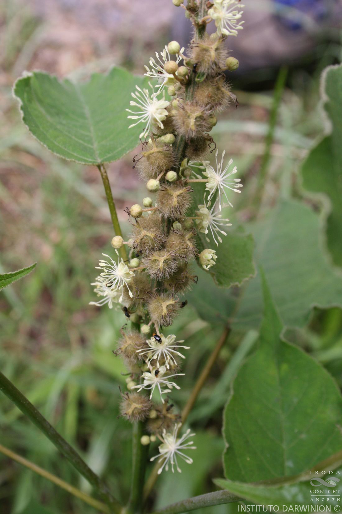 Arbustos monoicos de 1-4 m de alto, a menudo ramificados desde la base, con tricomas densos estrellado-porrectos con el radio central hasta de 2 mm de largo en las partes jóvenes; ramas cilíndricas, con tricomas laxos. Hojas alternas; pecíolos de 2,5-15 cm de largo, con 2(-6) glándulas cilíndricas o con ápice pateliforme y estípite de 0,5-1 mm de largo, dispuestas en la cara abaxial o bien en la unión con la lámina o en la base de la lámina junto al nervio central; estípulas casi obsoletas: láminas ovadas, ovado-oblongas o cordadas, de 5-15 × 2,5-10 cm, membranáceas, con 5-8 pares de nervios de cada lado de la nervadura central, ápice acuminado, base redondeada a cordada, margen ciliado-denticulado con tricomas estrellado-porrectos dispersos a densos en la cara abaxial, subglabras en la cara adaxial o con tricomas a lo largo de los nervios. Inflorescencias espiciformes a racemiformes, terminales, gráciles, 2-sexuales, de 6-30 cm de largo, erguidas a nutantes, con numerosas flores densas dispuestas en címulas 2-sexuales en la base y címulas exclusivamente estaminadas en el ápice. Flores estaminadas con pedicelo de 1,5-3 mm de largo; sépalos 5, triangulares, ca. 2 mm de largo; pétalos 5, oblongos, de 2-2,5 mm de largo, ápice agudo; receptáculo viloso; estambres 16-23, filamentos de 2,5-3 mm de largo. Flores pistiladas subsésiles; pedicelo hasta de 1 mm de largo; bráctea basal pequeña; sépalos angostamente triangulares, de 2-3 mm de largo, agudos; pétalos ausentes o rudimentarios; ovario globoso, ca. 2 mm de diámetro, hirsutos, cubierto con tricomas estrellado-porrectos blancuzcos; estilos profundamente 2-fidos, ramas estigmáticas 6, filiformes, de 2,5-3,5 mm de largo, patentes. Fruto cápsulas globosas, levemente 3-lobadas, de 5-6 mm de diámetro, densamente híspidas, con tricomas blanquecinos con el radio central hasta de 2 mm de largo; columela de 3,5-5 mm de largo, con 3 lóbulos lisos ascendentes. Semillas de contorno oblongo a cilíndricas, de 3,5-4,5 × 2 mm, con extremos redondeados, algo aplanadas, castaño oscuras, superficie rugosa-ondulada, con carúncula triangular subapical.