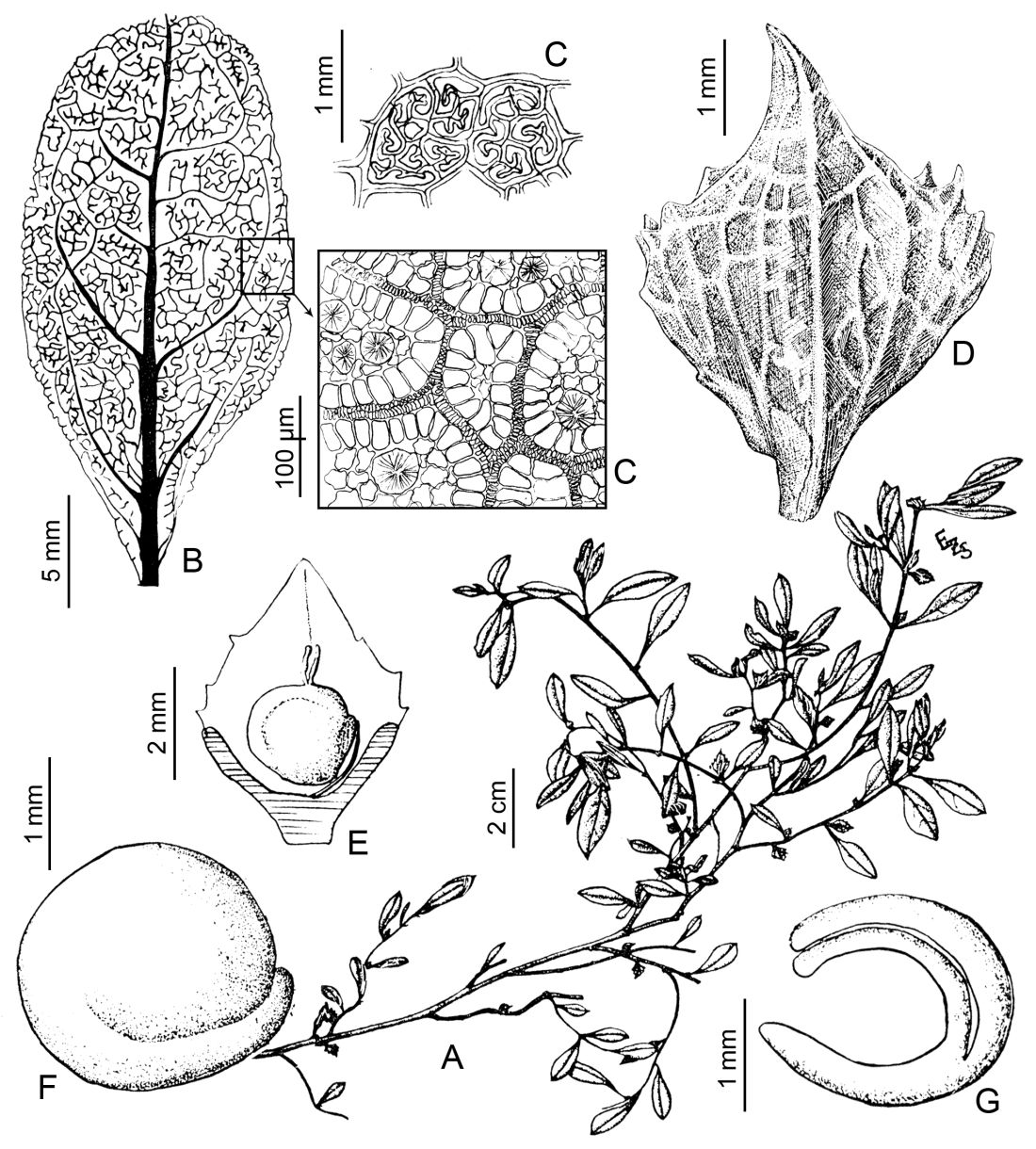 A. Planta. B. Hoja. C. Detalle de la venación Kranz. D-E. Bractéolas fructíferas, cara externa y cara interna con el fruto, respectivamente. F. Semilla. G. Embrión.