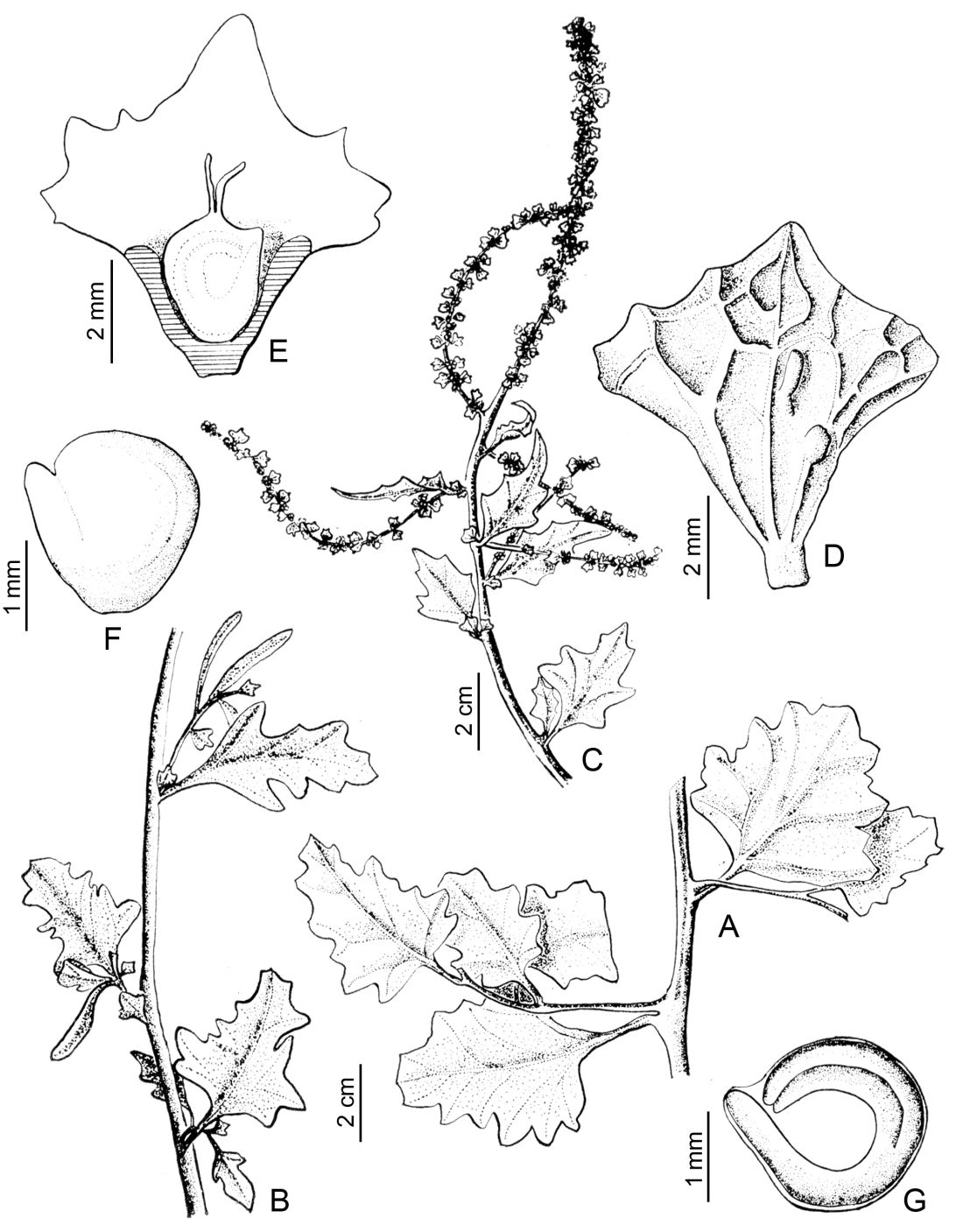 A-B-C. Aspecto de diferentes ramas. D-E. Bractéolas fructíferas, cara externa y cara interna con el fruto, respectivamente. F-G. Semilla, aspecto externo y corte longitudinal mostrando el embrión, respectivamente.