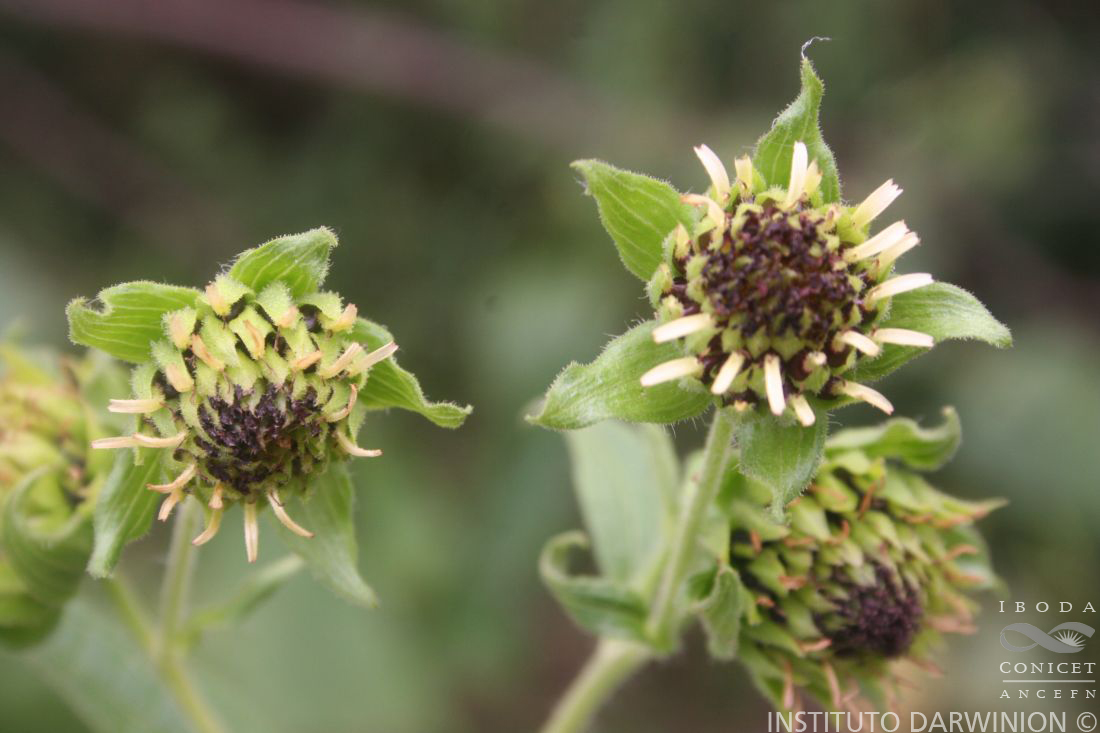 Hierbas perennes, de 1-3 m de alto; tallos glandulosopubescentes. Hojas opuestas; pecíolos alados, con aurículas connadas; láminas ovado-deltoides a levemente ovadas, de 11- 24 × 5-16 cm, ápice agudo, margen irregularmente dentado, 2-4 lobado-dentado, glanduloso-pubescentes en ambas caras. Capítulos 3-5, dispuestos en cimas racimosas; pedúnculos de 3- 9 cm de largo, densamente pubescentes. Involucro acampanado a hemisférico, de 8-16 × 12-17 mm; filarios 3-seriados, los externos ovados, de 11-16 × 4-10 mm, con ápice agudo, los internos ovados, de 5-9 × 2-4 mm, glanduloso-pubescentes, envolviendo parcialmente a los aquenios. Receptáculo con páleas sub-ovadas u oblongas, de 4-7 mm de largo, con ápice agudo. Flores del margen ca. 20, dispuestas en 2 series, con corolas amarillas, lígula ovada a oblonga, de 4-6 mm de largo, con tubo de 2 mm de largo; las del centro ca. 40, con corolas amarillas de 7 mm de largo, tubo de 1,8-2 mm de largo. Aquenios obovoides, de 3-5 × 2,5-3,5 mm, glabros. Papus ausente.