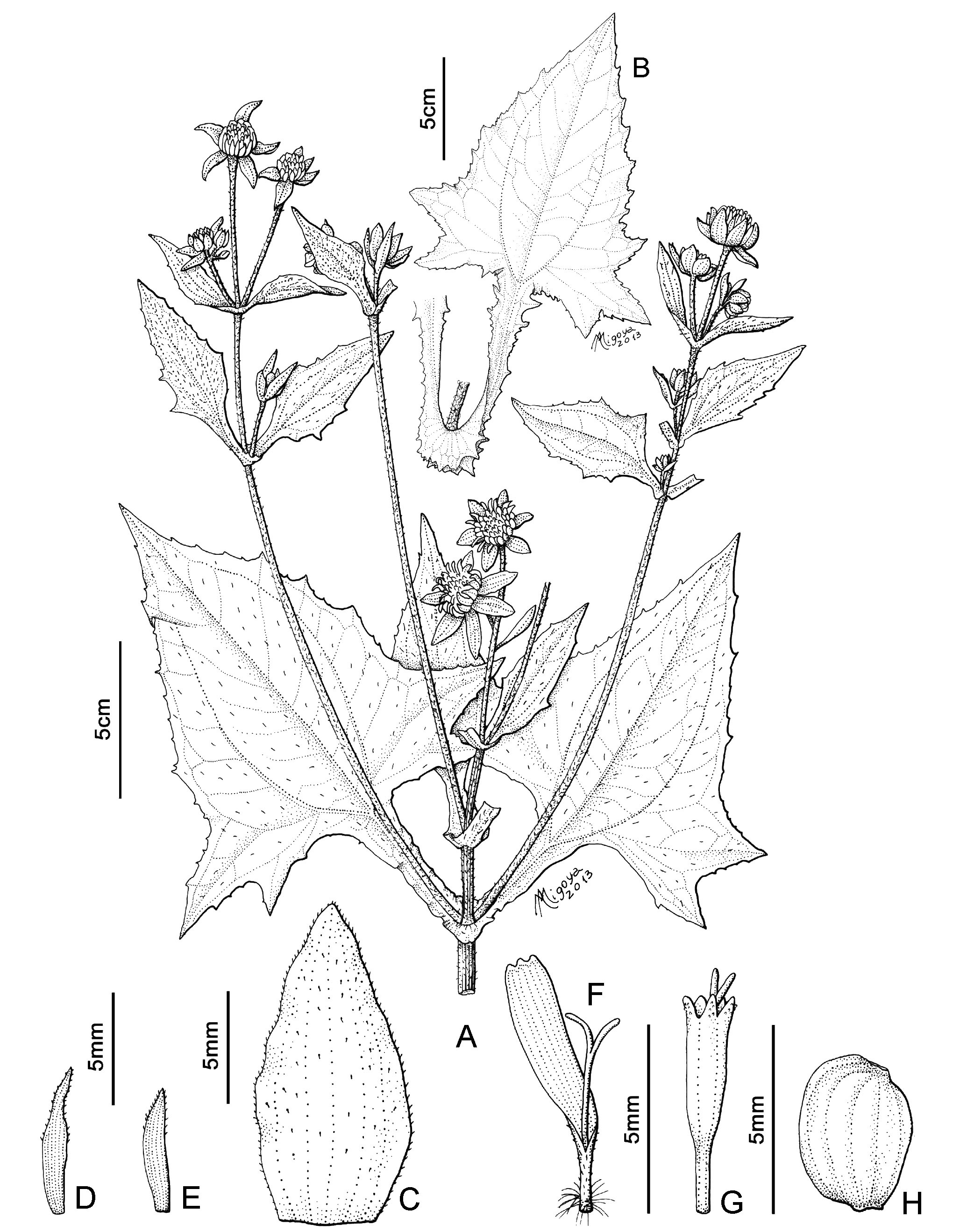 Hierbas perennes, de 1-3 m de alto; tallos glandulosopubescentes. Hojas opuestas; pecíolos alados, con aurículas connadas; láminas ovado-deltoides a levemente ovadas, de 11- 24 × 5-16 cm, ápice agudo, margen irregularmente dentado, 2-4 lobado-dentado, glanduloso-pubescentes en ambas caras. Capítulos 3-5, dispuestos en cimas racimosas; pedúnculos de 3- 9 cm de largo, densamente pubescentes. Involucro acampanado a hemisférico, de 8-16 × 12-17 mm; filarios 3-seriados, los externos ovados, de 11-16 × 4-10 mm, con ápice agudo, los internos ovados, de 5-9 × 2-4 mm, glanduloso-pubescentes, envolviendo parcialmente a los aquenios. Receptáculo con páleas sub-ovadas u oblongas, de 4-7 mm de largo, con ápice agudo. Flores del margen ca. 20, dispuestas en 2 series, con corolas amarillas, lígula ovada a oblonga, de 4-6 mm de largo, con tubo de 2 mm de largo; las del centro ca. 40, con corolas amarillas de 7 mm de largo, tubo de 1,8-2 mm de largo. Aquenios obovoides, de 3-5 × 2,5-3,5 mm, glabros. Papus ausente.